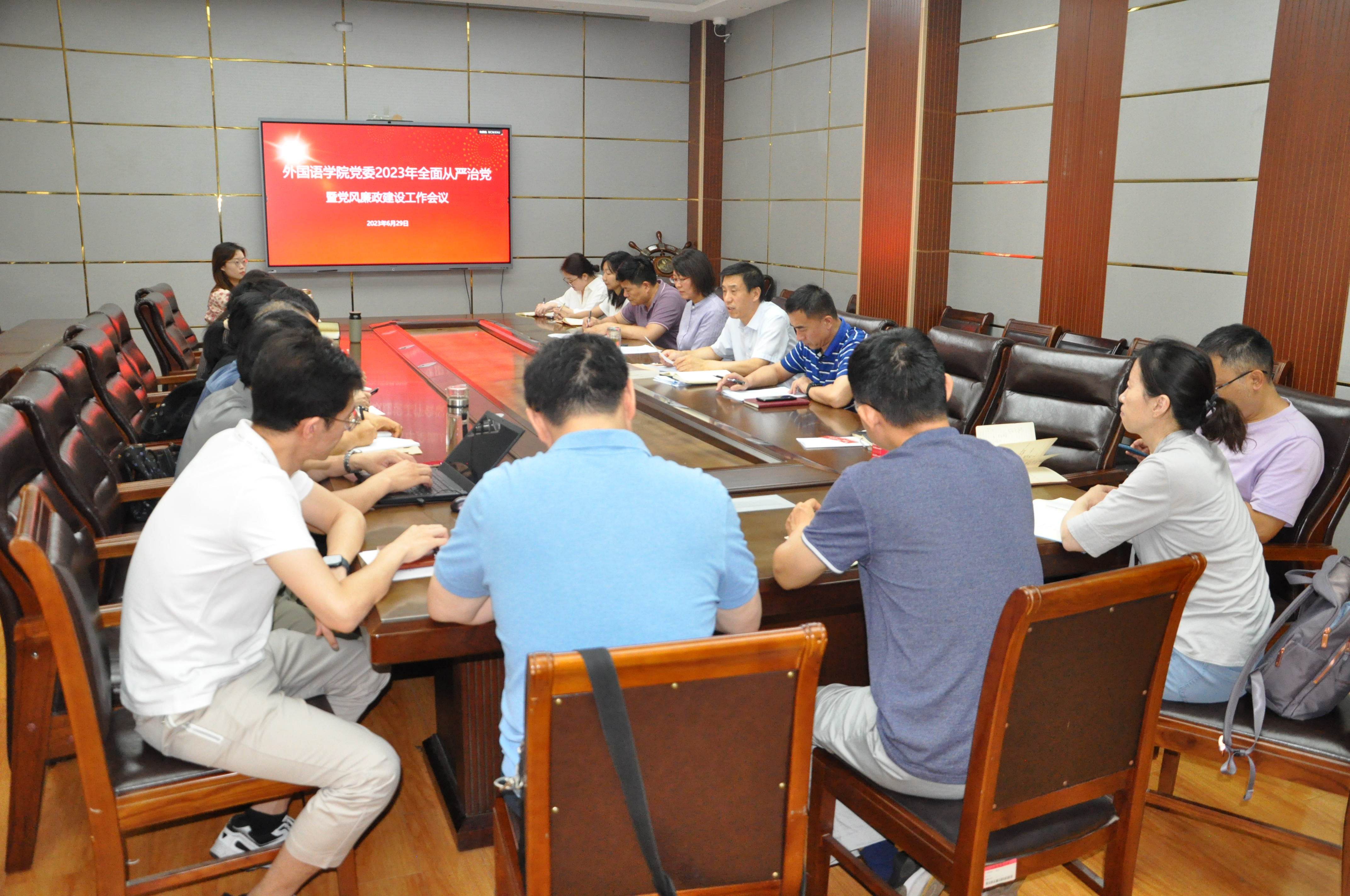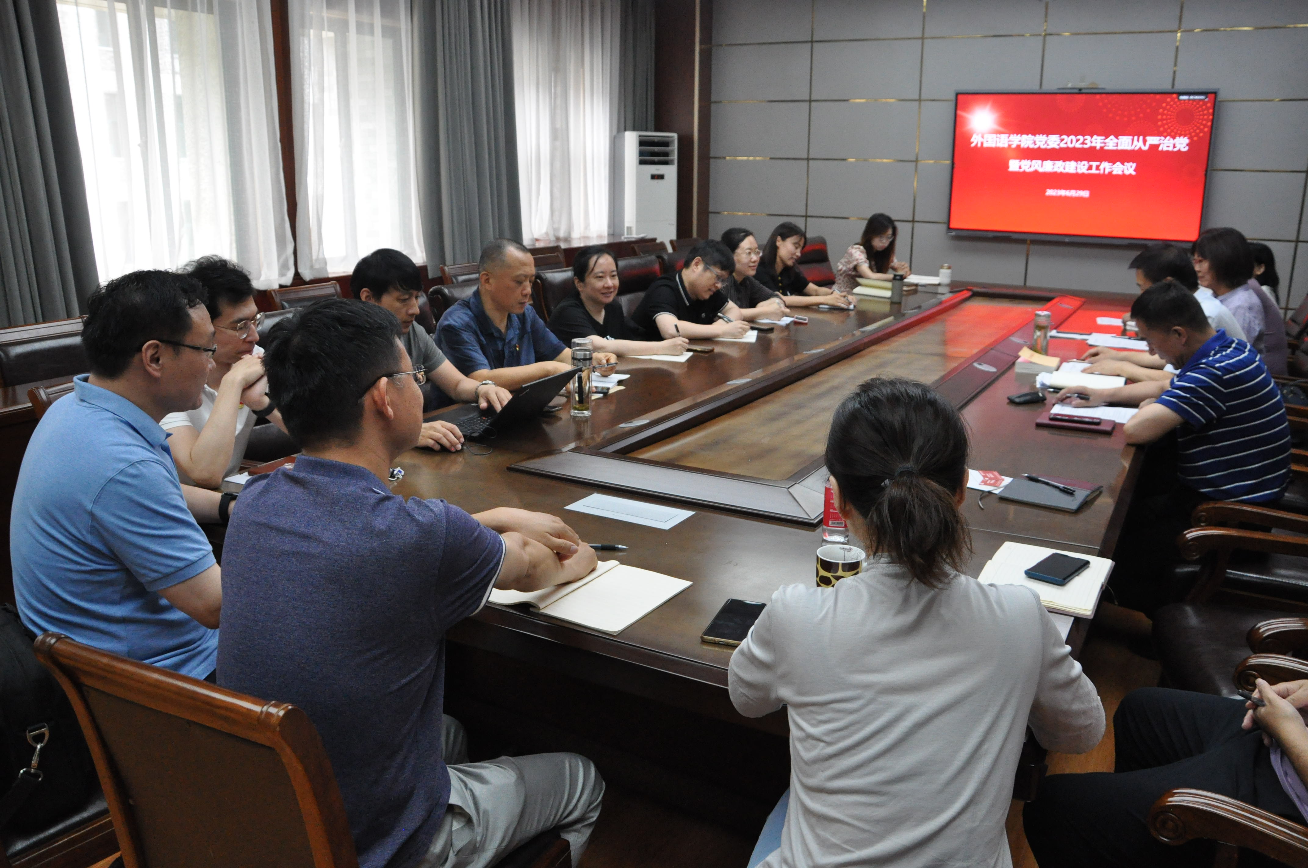 2023年6月29日上午,外国语学院党委在长清湖校区文渊楼A区313会议室召开全面从严治党暨党风廉政建设专题工作会议。学院党委委员,教工党支部书记和支部委员,科级以上干部,全体辅导员,学院主题教育工作领导小组办公室各工作组成员参加会议,学院党委书记岳希亮主持会议。