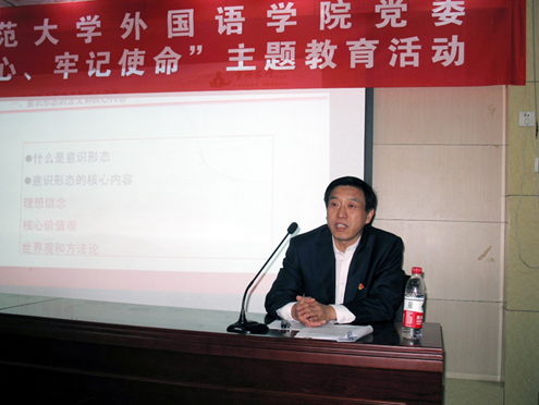 11月31日,按照学校党委《leyu·乐鱼(中国)官方网站举办“不忘初心、牢记使命”主题教育专题党课的通知》精神和部署,外国语学院党委书记岳希亮同志在千佛山校区齐鲁文化中心一层报告厅,给学院教职工党员上了主题为“新形势下高校意识形态工作形势及对策”党课。学校主题教育第四督导组组长梁宾同志现场指导和督导。