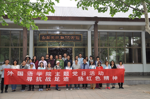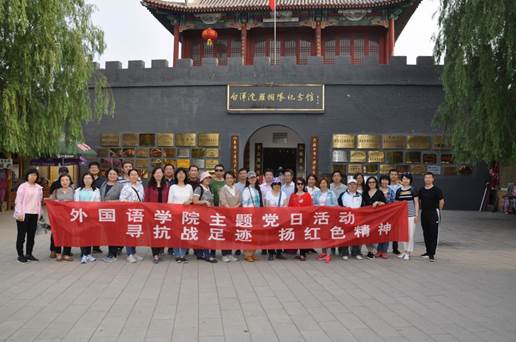 为缅怀党的光辉历史,讴歌党的丰功伟绩,教育和引导党员教师进一步坚定理想信念、牢记使命宗旨。2019年5月18日至19日,外国语学院党委组织党员和教职工开展以“寻抗战足迹 扬红色精神”的主题党日活动。赴雄安新区市民服务中心、白洋淀抗战纪念馆、雁翎队纪念馆、冉庄地道战遗址等红色教育基地参观学习。