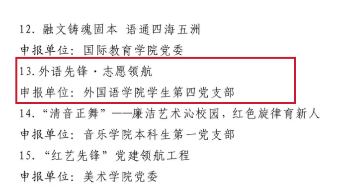 6 月 10 日,中共山东师范大学委员会公布了第五批基层党建工作品牌评选结果。本次评选由院级单位党委(直属党支部)推荐,经专家组评审,最终确定 41 个基层党建工作品牌入选。其中,外国语学院学生第四党支部的 “外语先锋・志愿领航” 和研究生第一党支部的 “译路向党,语通四海” 两个党建品牌成功入选。