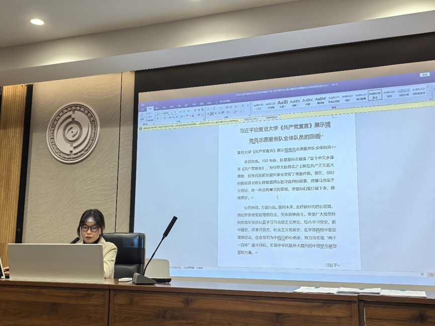 最后,党支部书记李启迪、组织委员徐喆先后带领全体党员同志深入学习领会《习近平出席金砖国家领导人第十六次会晤并发表重要讲话》《习近平给复旦大学<共产党宣言>展示馆党员志愿服务队全体队员的回信》。会议要求全体党员始终坚定理想信念,做有理想的青年党员,不断提高自己的理论修养和政治素养,积极参与支部活动,增强理论联系实际的能力,充分发挥先锋模范作用。