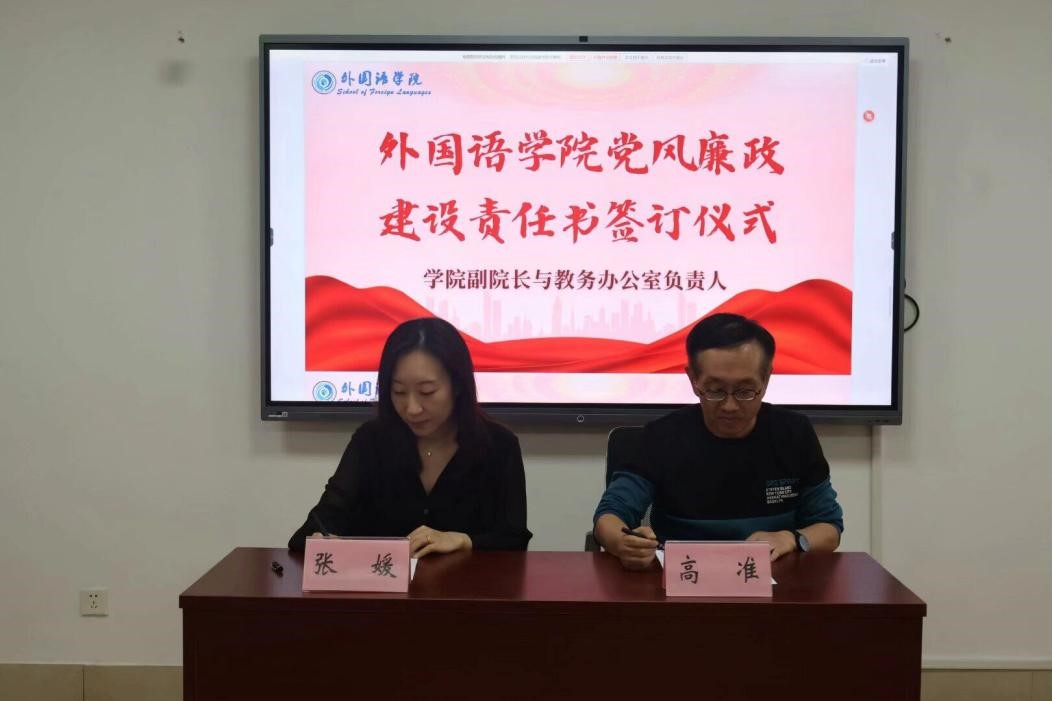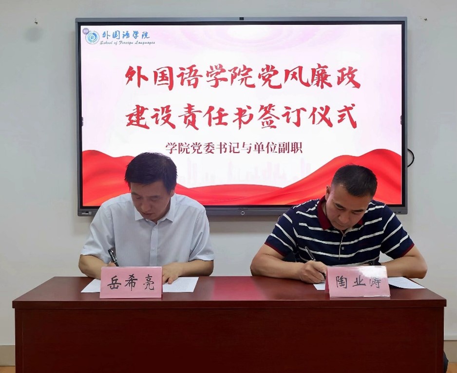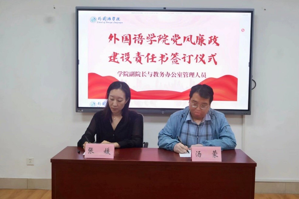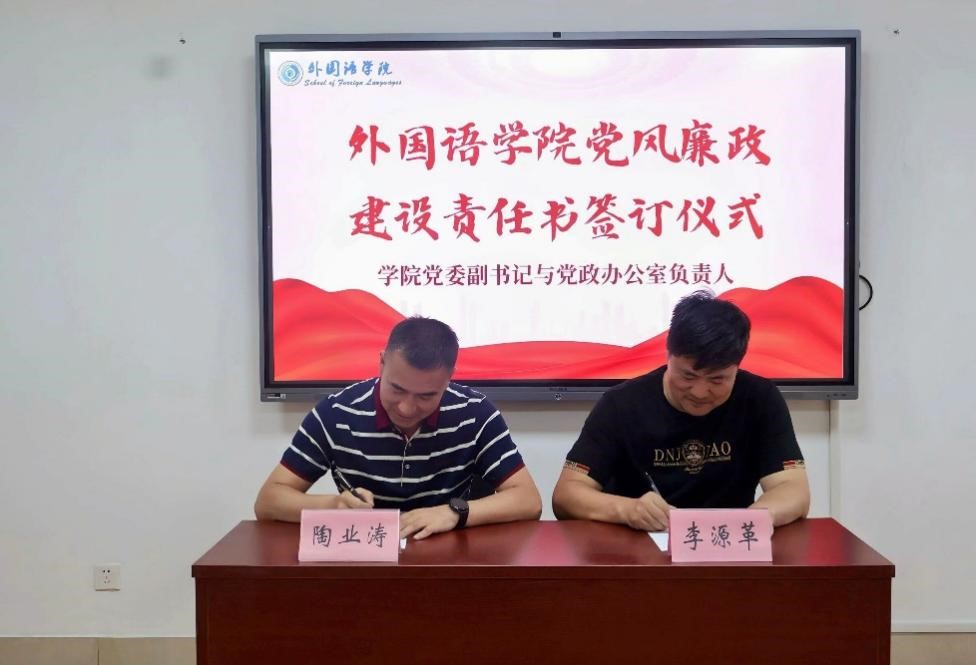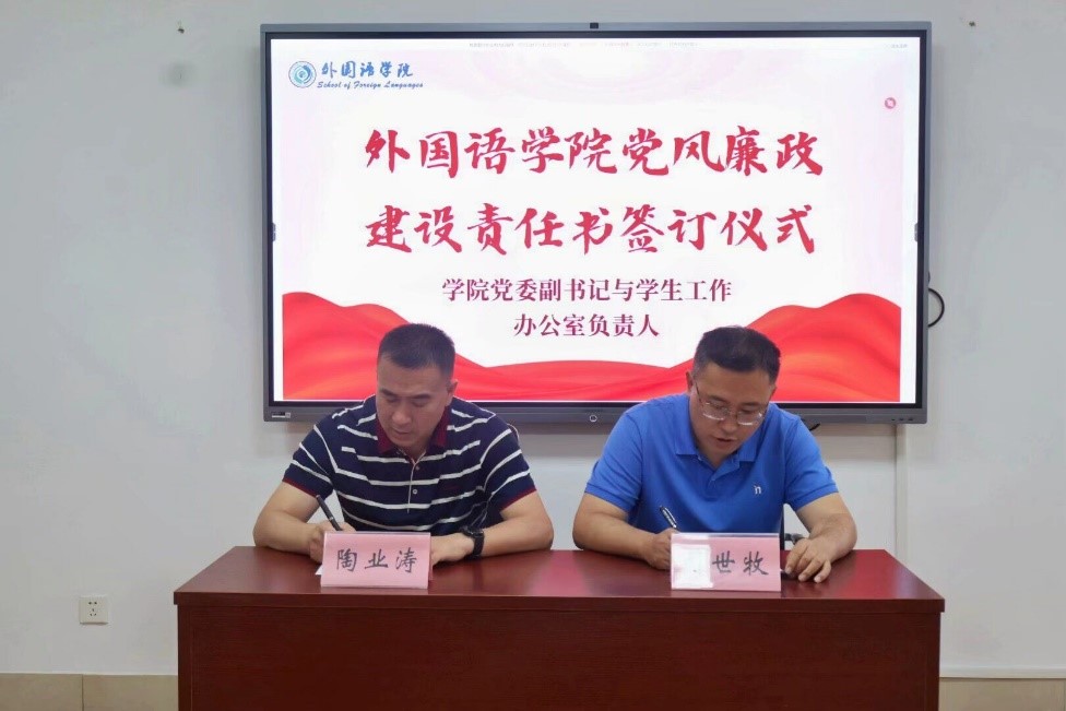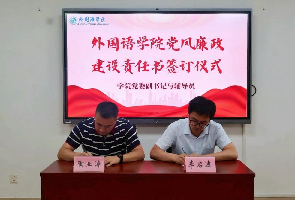 5月14日下午,外国语学院于文渊A321举行党风廉政建设责任书签订仪式,仪式由党委副书记陶业涛主持,学院领导班子成员、各党支部书记、科室主任、行政管理人员、全体辅导员参与签订仪式。