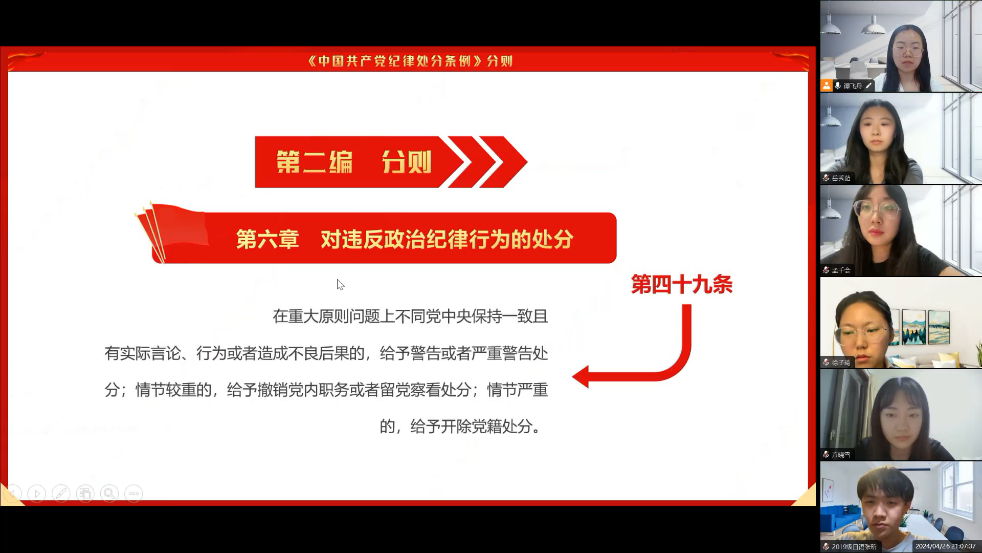 为进一步增强学习贯彻《中国共产党纪律处分条例》的政治自觉、思想自觉和行动自觉,教育引导全体党员强化纪律意识,提高党性修养,2024年4月26日晚,外国语学院学生第二党支部组织支部全体党员开展学习《条例》主题党课,进行线上集中纪律教育。