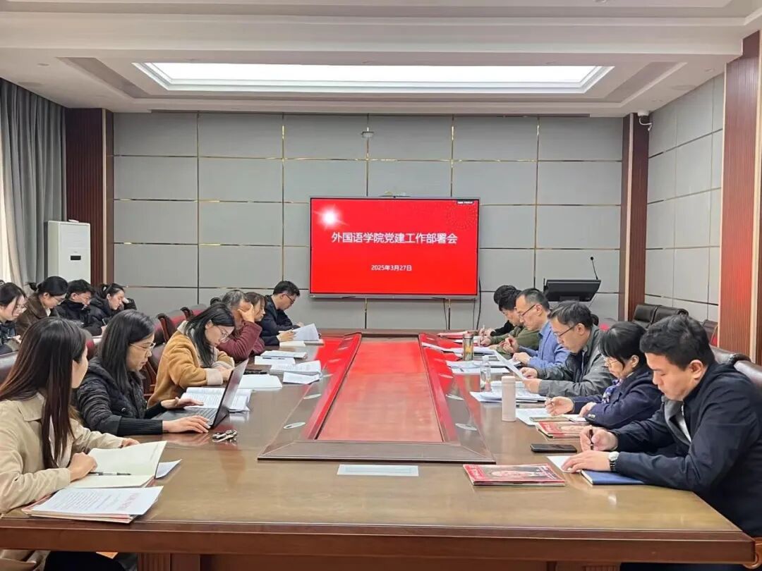 2025年3月27日下午,外国语学院党委在文渊楼A区313会议室召开会议,部署学院2025年党建工作。学院党委书记王松,党委副书记、纪委书记司世牧,党委委员、党政办主任李源革,组织员李宁宁、各党支部书记参加会议,会议由王松主持。