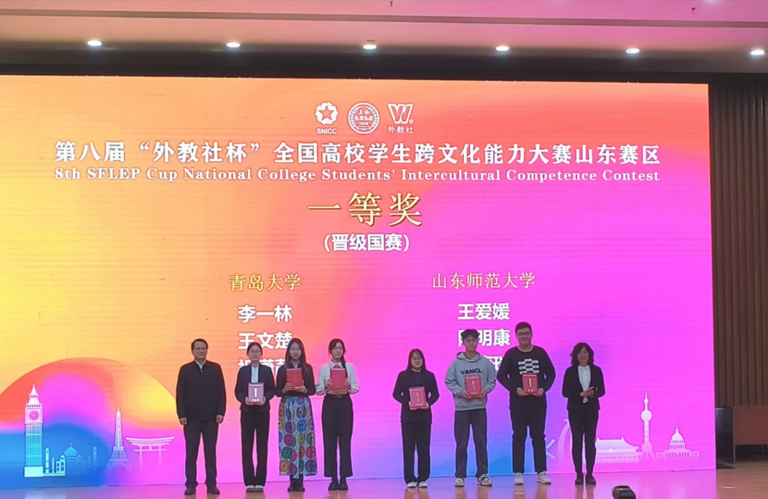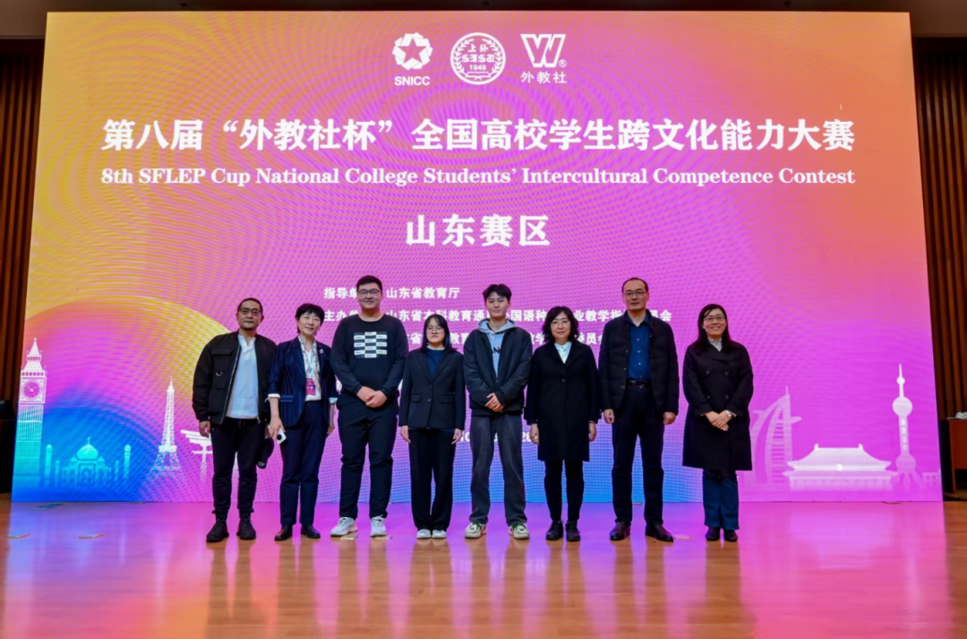 2025年10月25日-26日,第八届“外教社杯”全国高校学生跨文化能力大赛山东赛区比赛在山东师范大学文昌楼报告厅举行,我校参赛项目A Journey to the East荣获省赛一等奖,顺利晋级国赛。