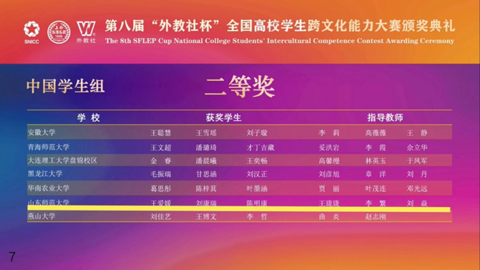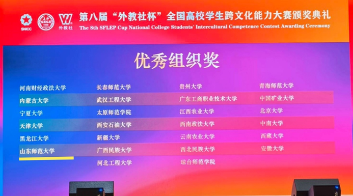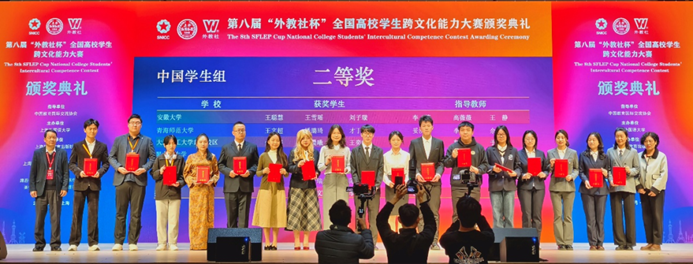 2025年12月11日-14日,第八届“外教社杯”全国高校学生跨文化能力大赛全国决赛、总决赛在上海外国语大学虹口校区举行,我校参赛项目Experiencing Chinese Kung Fu — A Journey to Decentered Understanding荣获大赛全国二等奖,我校获本届大赛优秀组织奖。