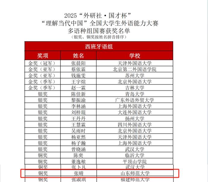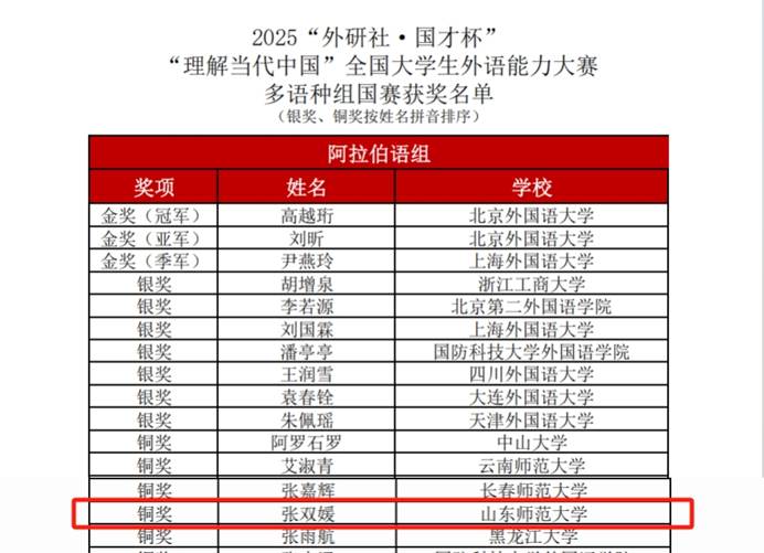 朝鲜语系陈菲,深挖竞赛难点、打磨展示细节,最终斩获铜奖;西班牙语专业学子张晴凭借扎实的专业功底与不懈努力,过关斩将,荣获国赛铜奖;阿拉伯语专业的张双媛同学凭借扎实的语言能力和沉稳的现场发挥同样摘得铜奖。