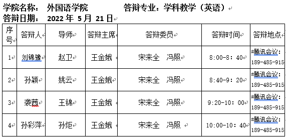 2022.5.21外国语学院2022届学科教学(英语)专业硕士研究生答辩公告
