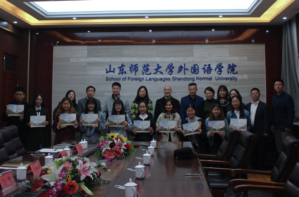 11月5日,外国语学院于山东师范大学长清湖校区文渊楼A区学院会议室举办了第四届薪火奖学金颁奖仪式。外国语学院88级校友代表孙岩梅、刘燕玲,刘翔宇、周新宇、周志民、陈沛志、周连勇、岑玮等到场参加颁奖仪式。外国语学院党委书记岳希亮,副院长胡艳玲,团委书记司世牧,2018级辅导员刘铭,2016级辅导员付晓朦,2017级辅导员侯得霞以及2017级十位薪火奖学金获得者出席了本次仪式。仪式由外国语学院党委副书记金鹏主持。