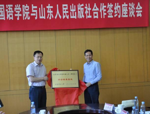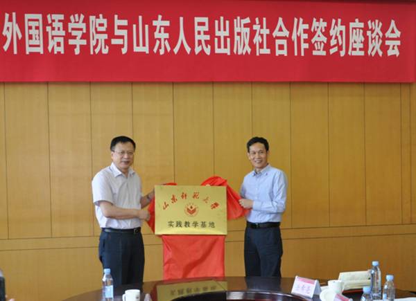 山东师范大学党委常委、纪委书记姚东方与山东出版集团党委副书记、总编辑迟云共同为“联合培养基地”、“教学实践基地”揭牌。