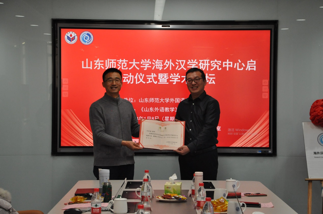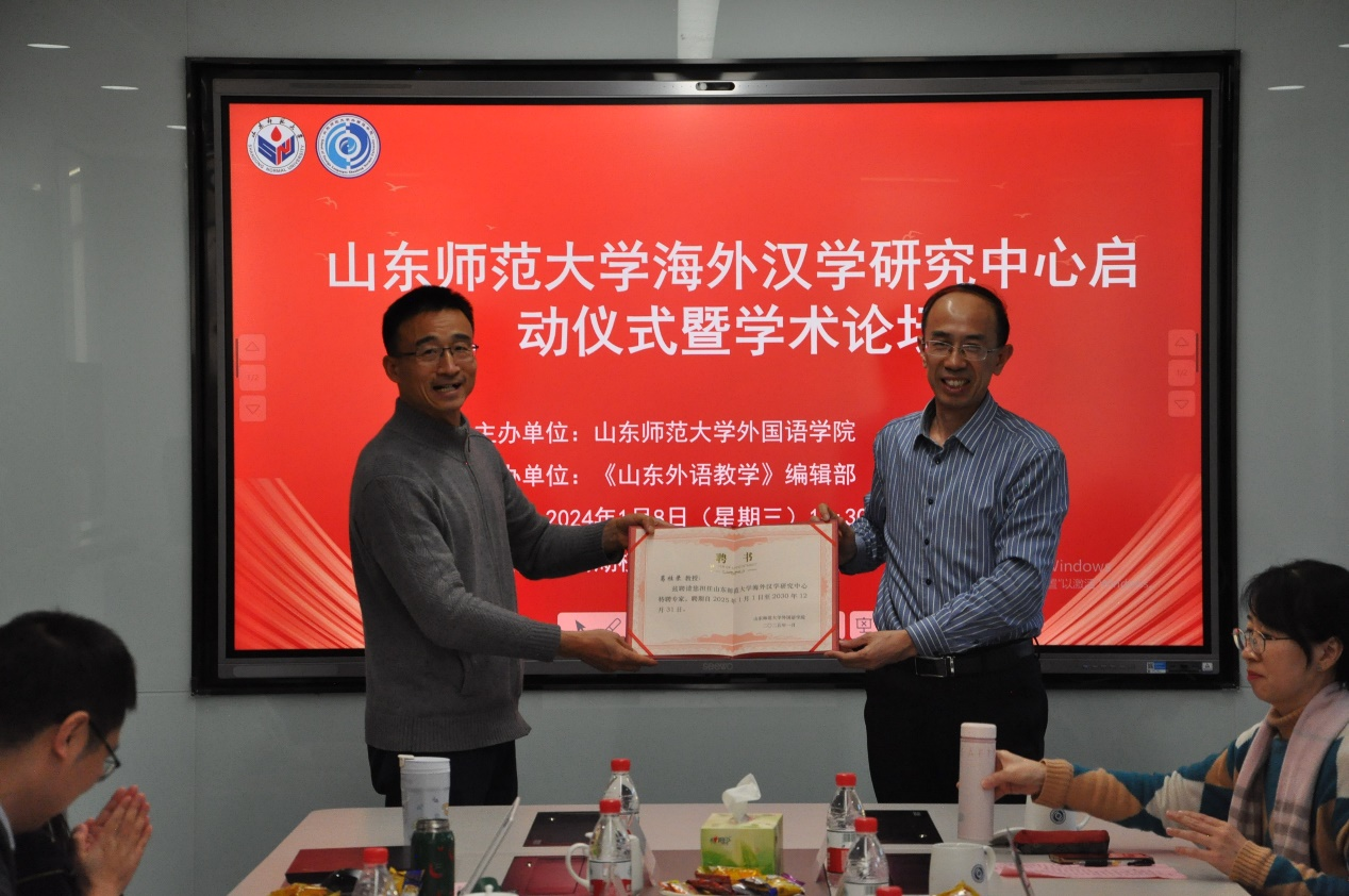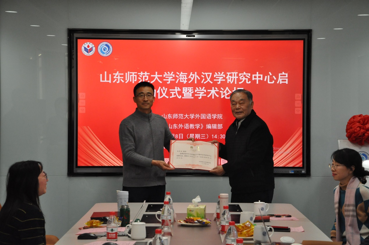 最后,在热烈的掌声中,高景海处长与山东大学郑杰文教授共同为山东师范大学海外汉学研究中心揭牌,标志着该中心正式成立。高处长还逐一为与会专家颁发了特聘专家证书。