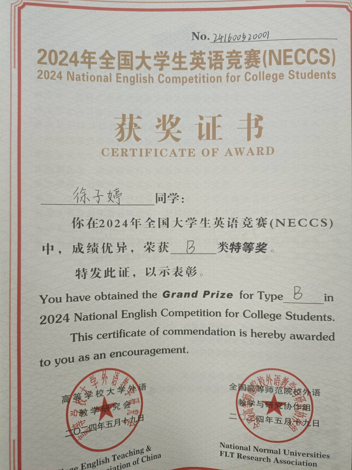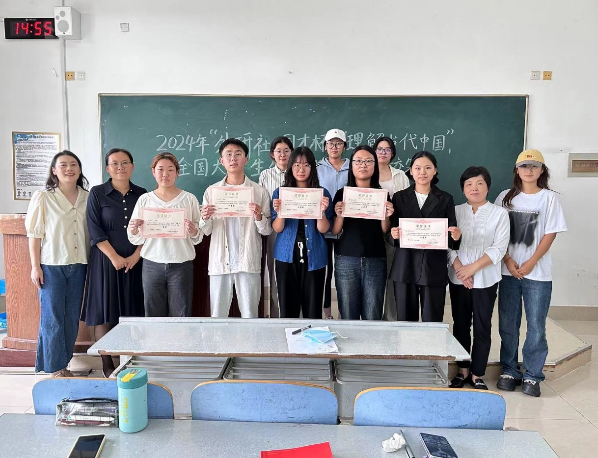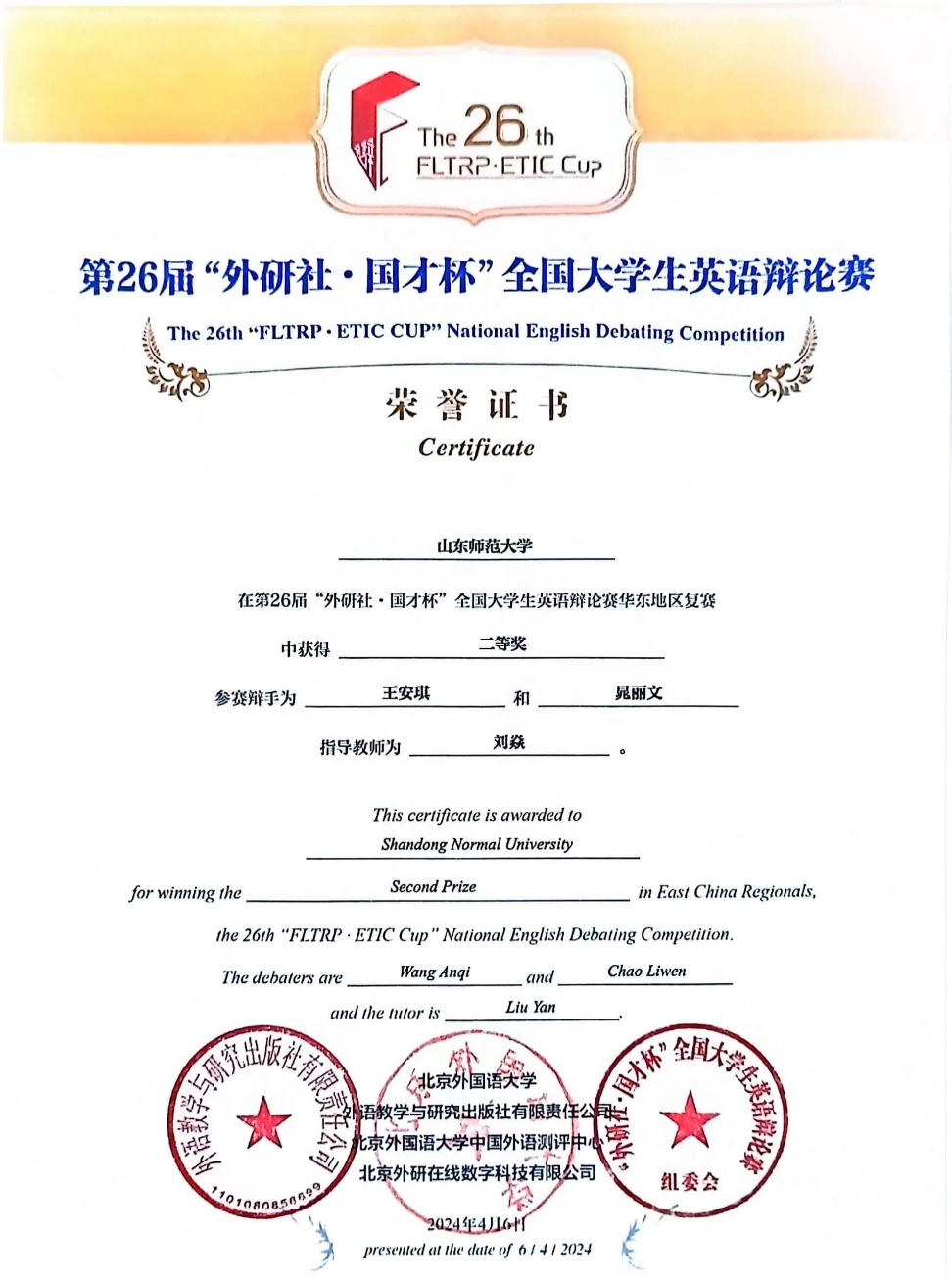 在2024年10月举行的上海外语教育出版社的“外教社杯”全国高校学生跨文化能力大赛山东赛区复赛中,王珑珑、李繁、刘焱老师指导的晁丽文、郭美辰、孙艺渲团队获得省赛三等奖。