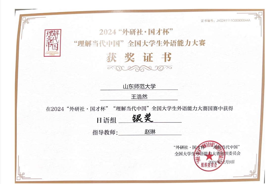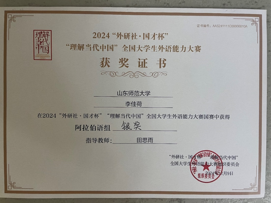 在2024年11月举行的“外研社·国才杯”“理解当代中国”全国大学生外语能力大赛山东赛区复赛中,我校共有12名同学参加比赛,其中陈琳琳老师指导的王爱媛、刘焱老师指导的张恬润获演讲赛项金奖,禚文渊老师指导的田涵宇、毕晓毅老师指导的张梦雪、姚云老师指导的潘心妍、陈琳琳老师指导的冯喜悦获综合赛项银奖,万方老师指导的王宏瑜获笔译赛项银奖,3名同学成功晋级国赛,其中王宏瑜获国赛笔译赛项全国银奖,创造了山师学子参加该赛项以来的最佳成绩,王爱媛、张恬润则分获两项铜奖。日语专业赵琳老师指导的王浩然和俄语专业王丽娜老师指导的郝美艳分别晋级日语组国赛、俄语组国赛,阿拉伯语专业田思雨老师指导的李佳荷、刘雨婷两位同学双双晋级阿拉伯语组国赛,山东师范大学成为山东赛区唯一一所两名阿拉伯语组省赛选手均晋级国赛的高校。上面四位选手中,日语专业王浩然、阿拉伯语专业李佳荷获得国赛银奖,俄语专业郝美艳、阿拉伯语专业刘雨婷获得国赛铜奖,无论是晋级数量还是奖项名次,都取得了新的突破和提升。