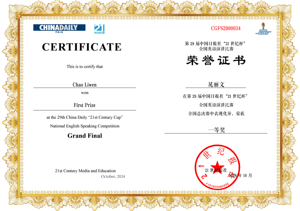 “21世纪杯”全国英语演讲大赛全国一等奖