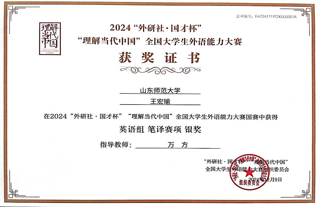 “外研社·国才杯”“理解当代中国”全国大学生外语能力大赛笔译赛项银奖