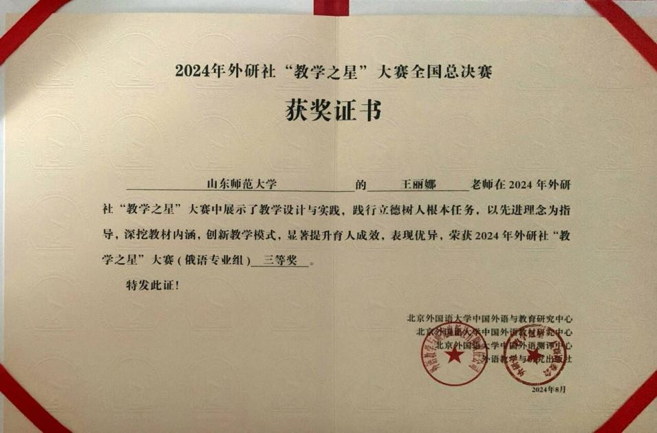 2024年8月15-16日,2024年外研社“教学之星”大赛俄语组全国总决赛成功举办。我院俄语系教师王丽娜,王艺璇代表我校参赛。经过激烈的角逐,两位老师脱颖而出,王丽娜老师获得全国总决赛三等奖,王艺璇老师获得全国总决赛优秀奖,向全国同仁展示了我校俄语教师优秀的教学能力。