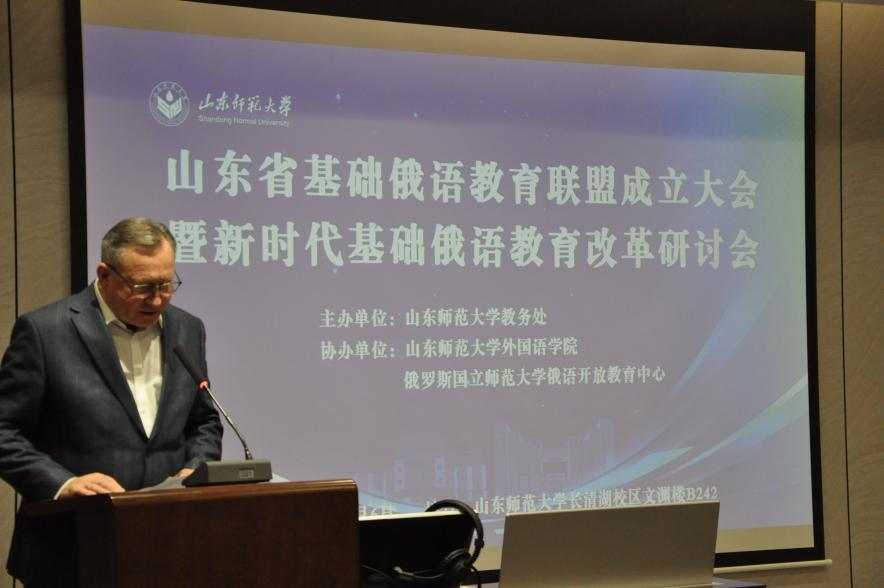 12月6日下午,在长清湖校区文渊楼B242会议大厅隆重举办了“山东省基础俄语教育联盟成立大会暨新时代基础俄语教育改革研讨会”。会议邀请山东师范大学党委常委、副校长张茂聪教授、山东大学教学促进与教师发展中心副主任李建刚教授、曲阜师范大学外国语学院副院长王洪明教授、山东师范大学赫尔岑国际艺术学院刘东峰院长、俄罗斯国立师范大学俄语开放教育中心负责人谢尔盖·马霍夫、东明一中校长张景永,临清三中党委书记单艳军等嘉宾出席。来自全省四十余所高中的校领导和俄语学科负责人等共60余人参加会议。外国语学院党委书记岳希亮、院长王卓、副书记陶业涛、副院长张媛、俄语系全体教师、部分学生代表等聆听了大会报告。联盟成立大会由外国语学院王卓院长主持。