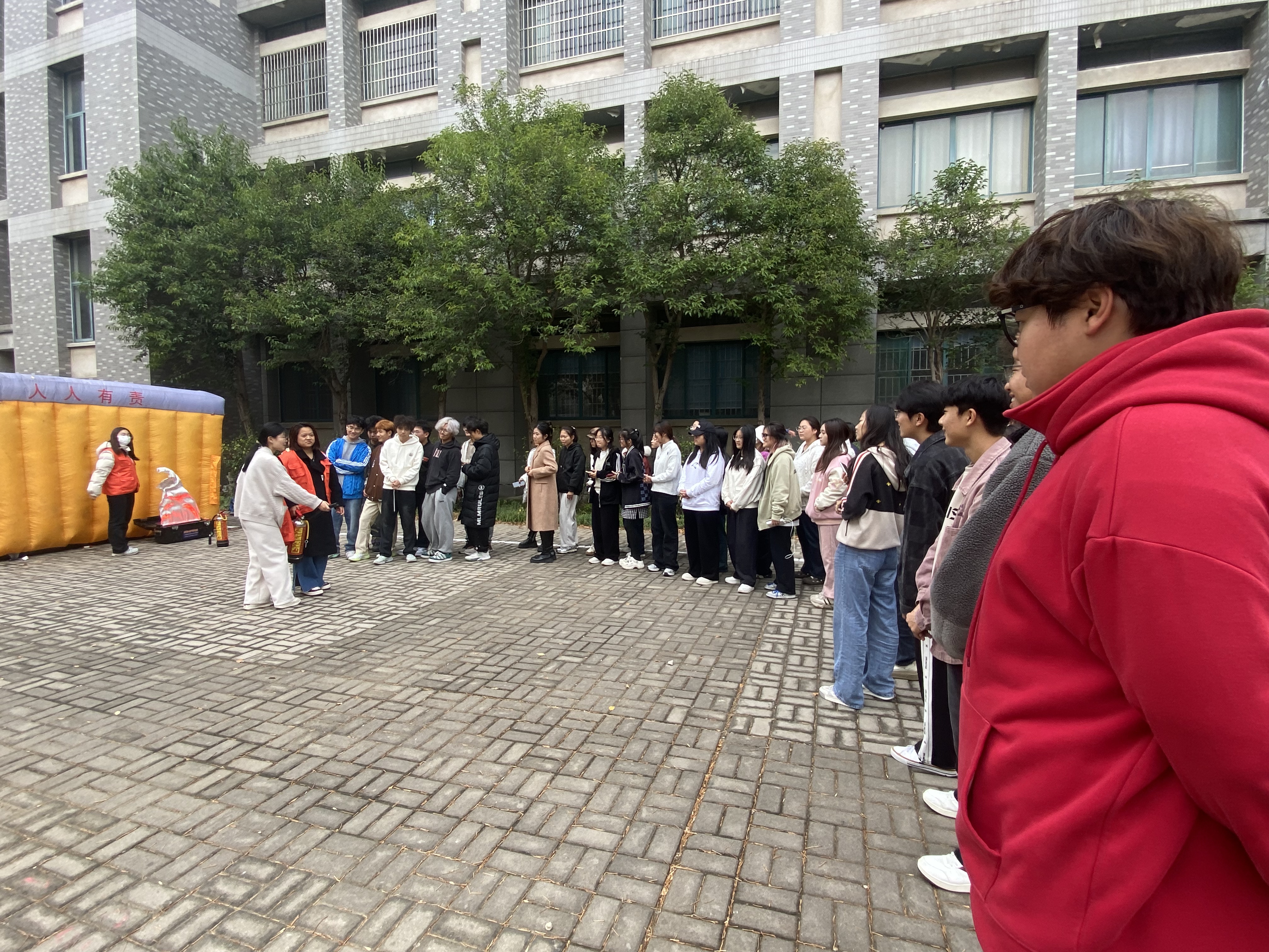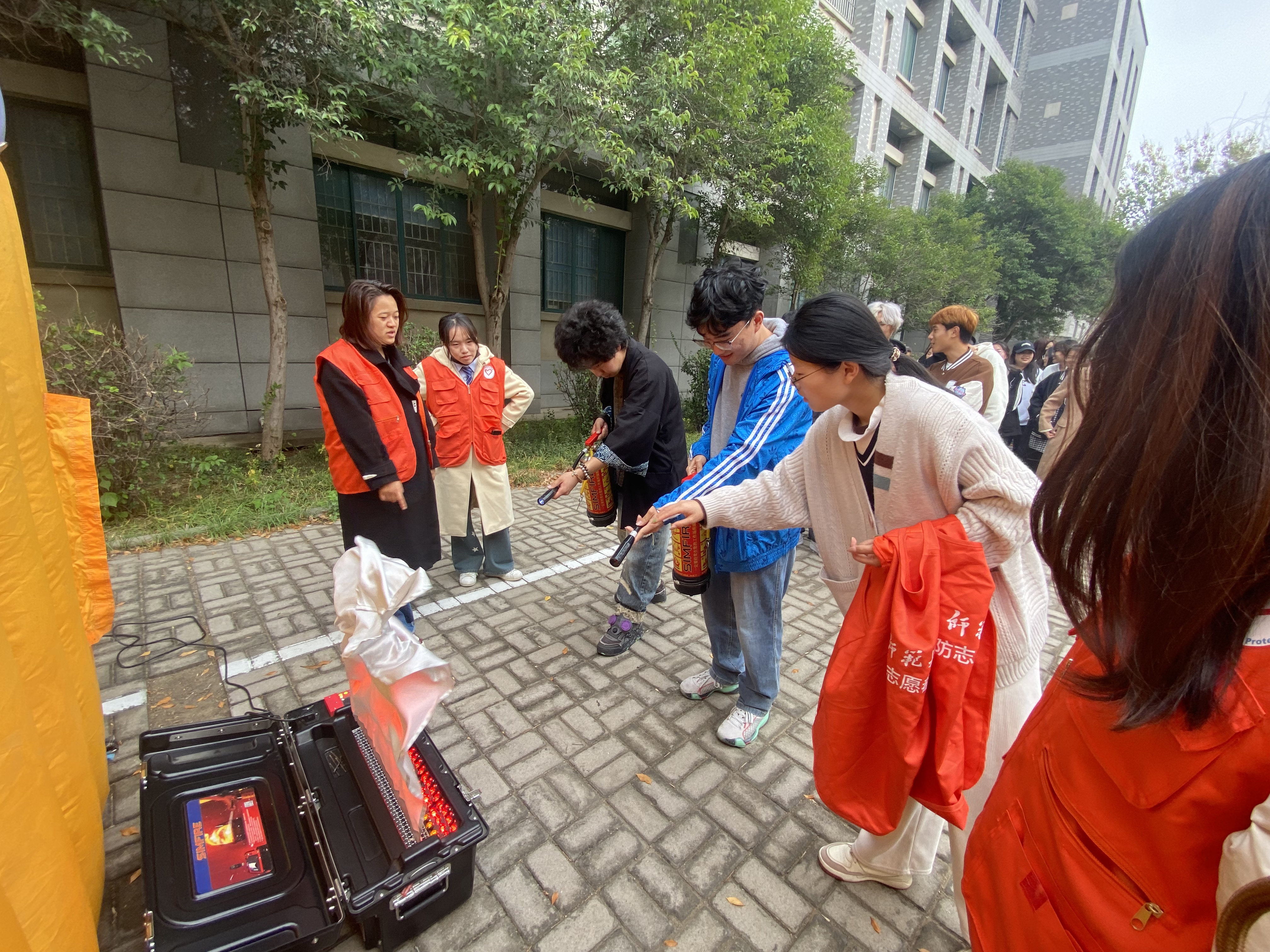 活动伊始,消防志愿者对到场师生进行了全面的消防安全知识宣讲,通过讲解火灾的危害、预防措施以及火场逃生技巧,使每位参加演练人员都充分认识到消防安全的重要性,并特别强调了在火灾发生时要保持冷静、迅速行动的原则。专家的讲解为后续的实战演练打下了坚实的基础。随后,老师与同学们练习使用电子灭火器,在志愿者的悉心指导下,扎实掌握了灭火器的使用技巧。最后,全体师生有序进入模拟烟雾逃生体验馆进行逃生演练。馆内烟雾弥漫,同学们捂住口鼻,弯腰低头,沿着规定的逃生路线迅速有序撤离,演练现场秩序井然。