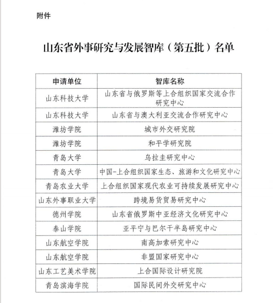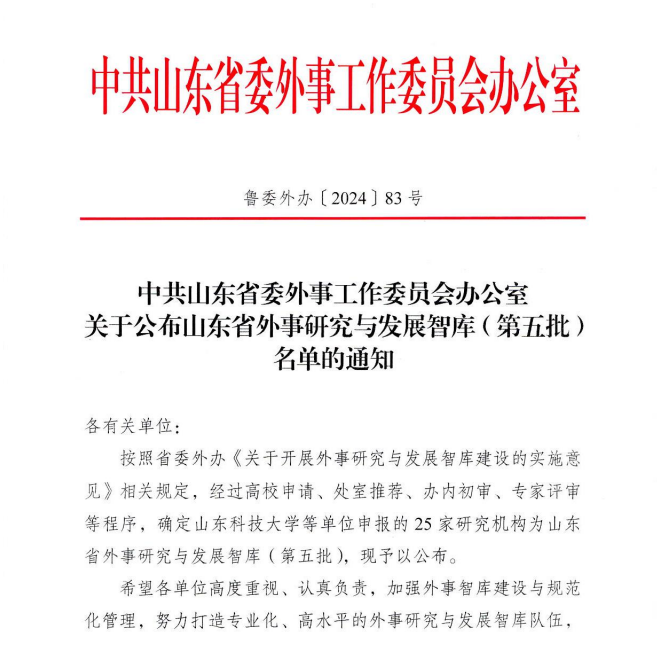 9月12日,中共山东省委外事工作委员会办公室发布了《leyu·乐鱼(中国)官方网站公布山东省外事研究与发展智库(第五批)名单的通知》(鲁委外办[2024]83号),我院申报的“山东省与日本交流合作研究中心”获批入选,这也是我院继2023年“山东省与东非地区交流合作研究中心”成功入选第四批山东省外事研究与发展智库后,在智库建设方面取得的又一个可喜成绩。