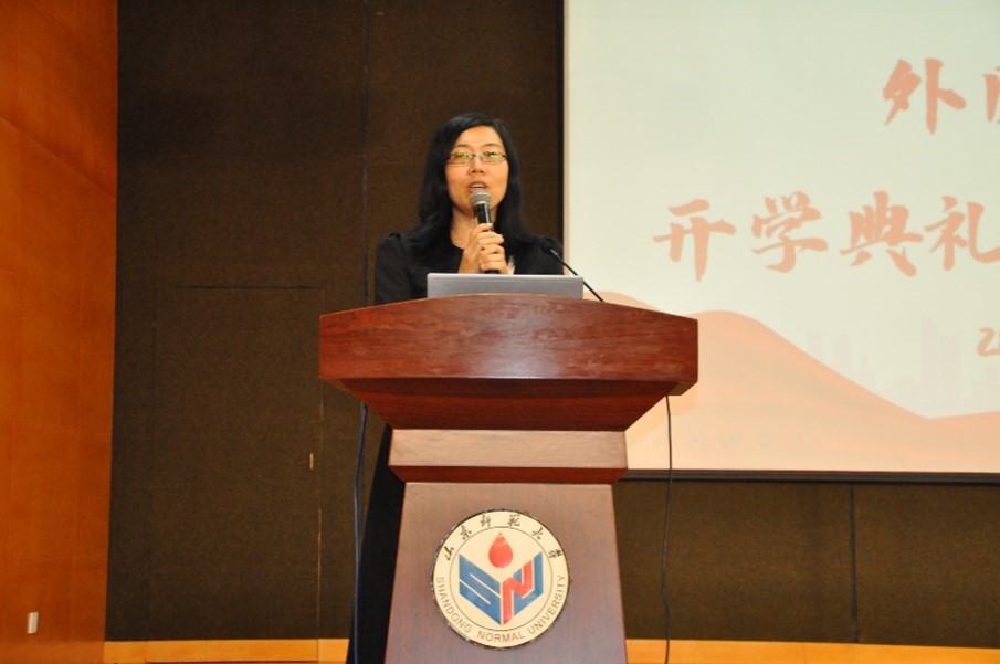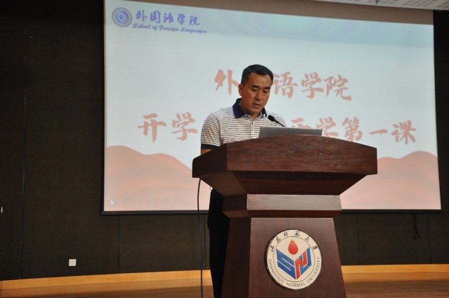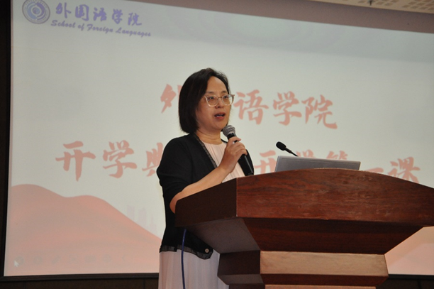 王卓院长给新生们带来了开学第一课。首先,王卓为新生们介绍了外国语学院的基本情况。山东师范大学是一所历史悠久的综合性师范大学,同时也是山东省规模最大、学科门类最齐全的师范类院校,山师外院同样也是历史悠久,文脉悠长。随后,她又介绍了山师外院考研率,近年来一直保持在较高水平。随着国家国际形势的发展,外国语学院着力培养复合型和跨学科性专业人才,直接对接国家战略发展要求,不仅要熟练掌握听说读写译的基本技能,更要做到用外语讲好中国故事,更好的服务于国家对外发展战略,为人类命运共同体作出贡献。最后,她期望同学们能够勇于挑战自己,战胜自己,超越自己,增强自身心理素质,迎接生活中的压力。
