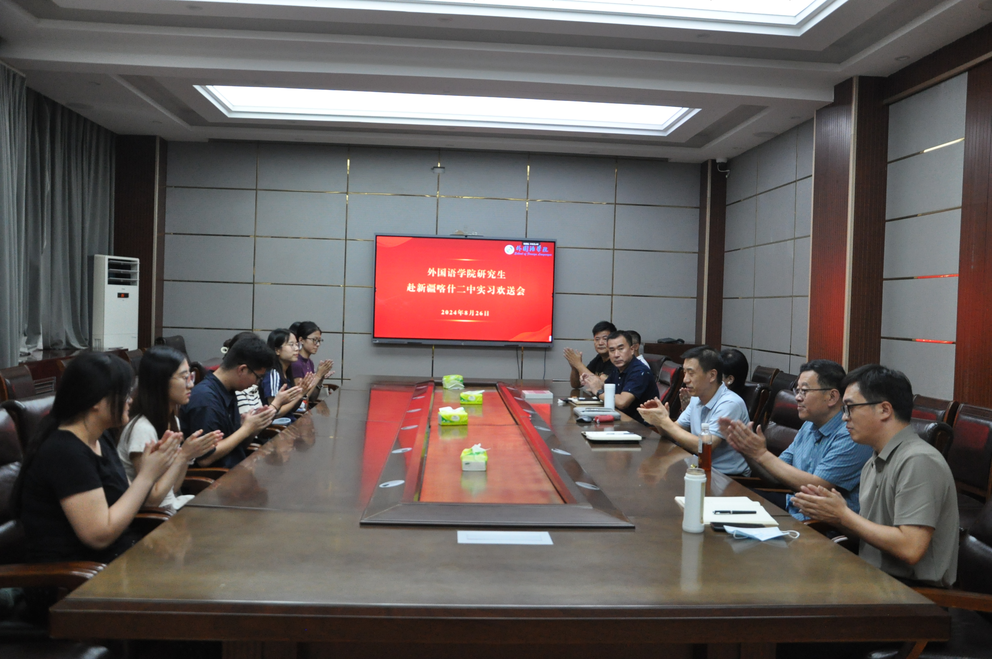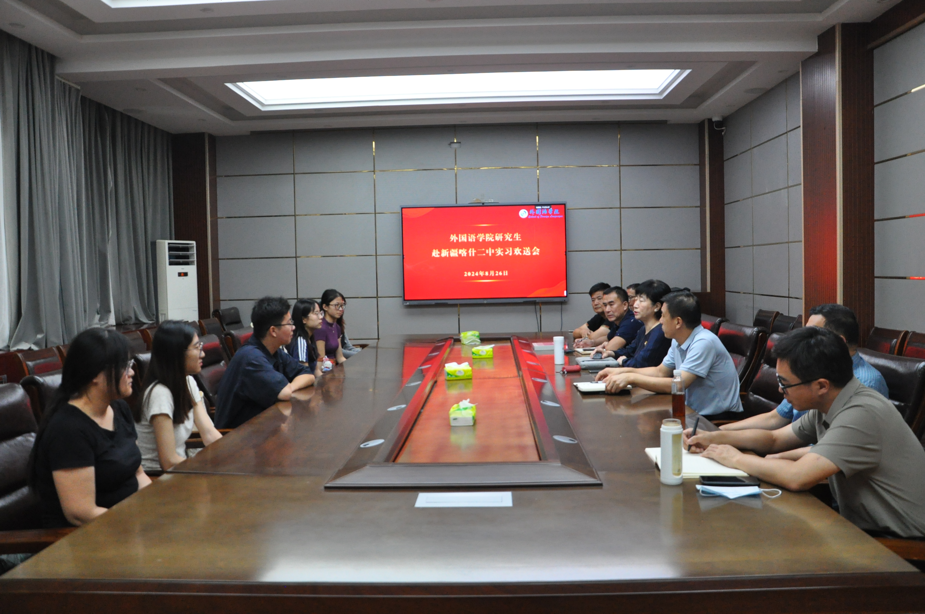 8月26日,外国语学院在文渊楼A区三层会议室举行研究生赴新疆喀什二中实习欢送会。王卓院长、岳希亮书记、陶业涛副书记、相关负责老师以及支教研究生参加欢送会。欢送会由外国语学院党委副书记陶业涛主持。