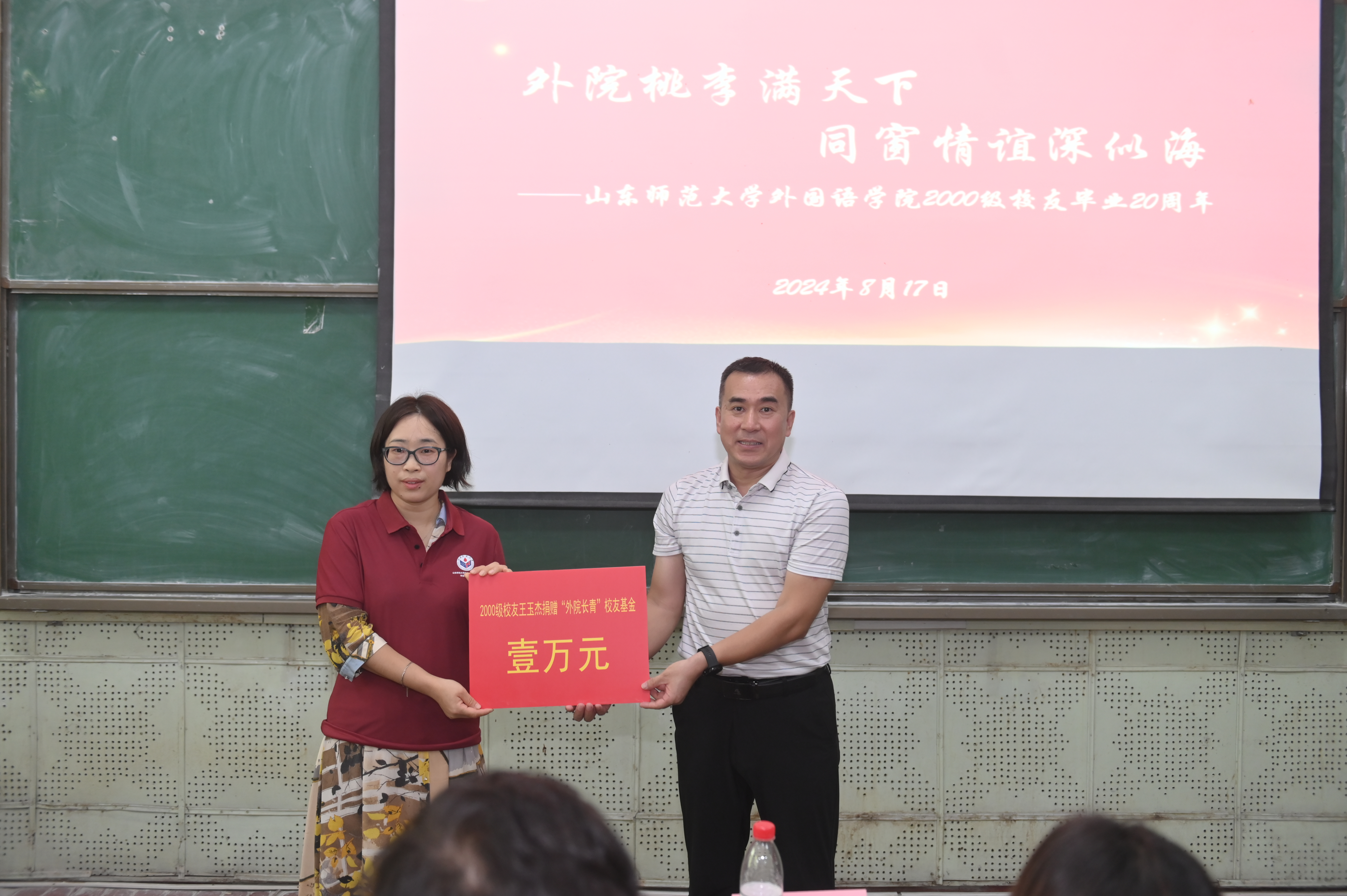 外国语学院党委副书记陶业涛代表学院接受2000校友王玉杰捐赠“外院长青”校友基金壹万元。
