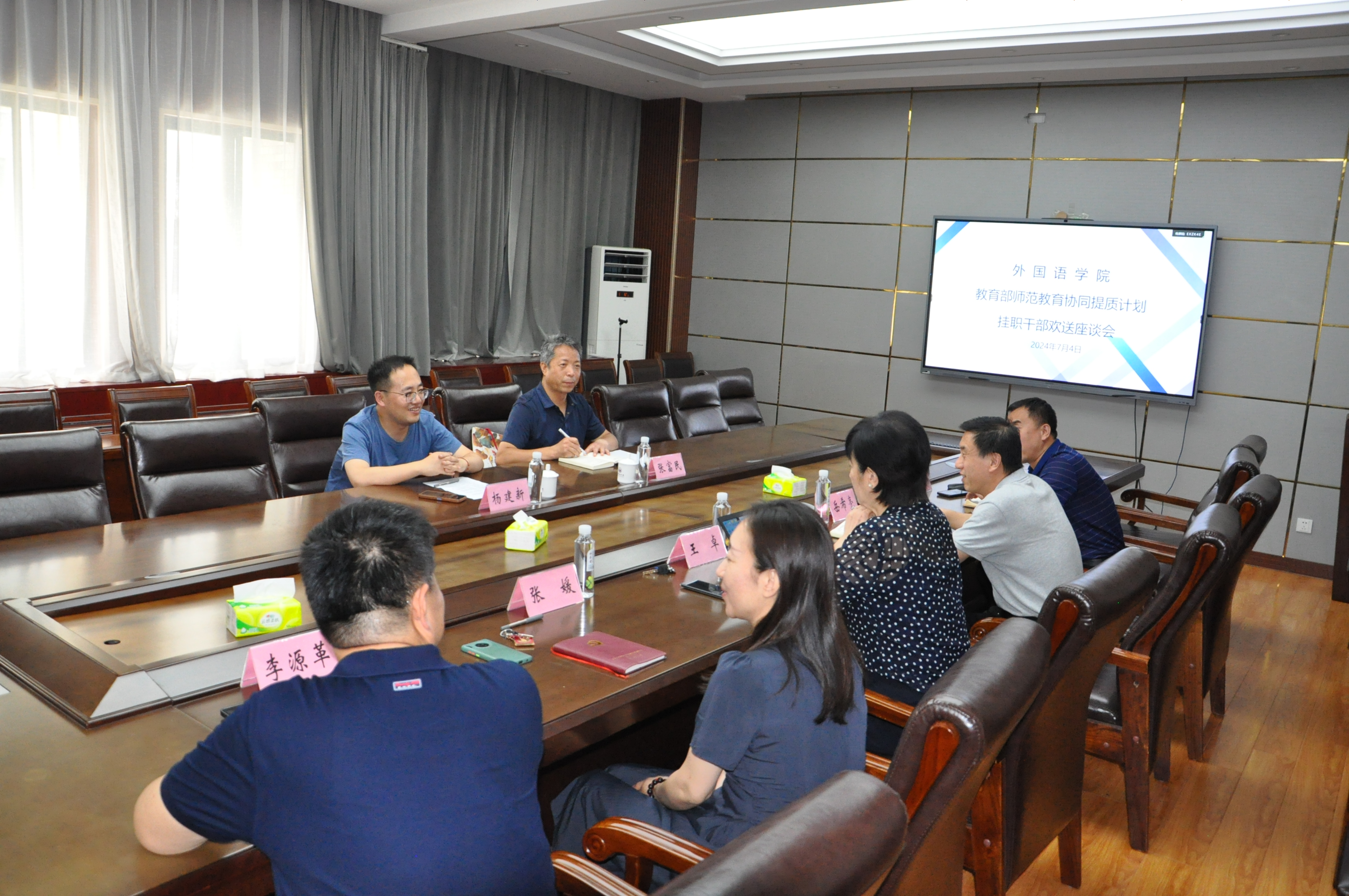 7月4日下午,在长清湖校区文渊楼A区外国语学院313会议室举行教育部师范教育协同提质计划挂职干部欢迎座谈会,欢送来外院挂职的河西学院杨建新副院长。参加座谈会的有外国语学院党委书记岳希亮、院长王卓、副书记陶业涛、副院长张媛,学院党政办公室主任李源革、学生工作办公室主任(团委书记)司世牧。河西学院访学教师张富民参加了座谈会。学院党委副书记陶业涛同志主持欢送会。