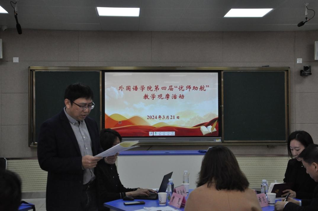 2024年3月21日上午,外国语学院在长清湖校区文渊楼C区150教室举办了第四届“优师助航”第一场教学观摩活动。此次活动由副教授高燕担任主讲教师。观摩课结束以后,学院在B区550教室进行了教学研讨活动。副校长周珊珊、教师教学发展中心主任贾斐、校级督导王金娥教授、外国语学院书记岳希亮、副院长张媛教授、院级教学督导组组长蒋斌副教授,以及20余位青年教师参加了此次活动。