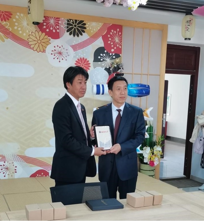 外国语学院党委岳希亮书记在济南中日交流之窗向滨口议长赠送纪念品