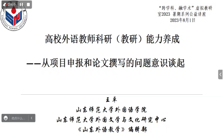 论文发表和项目申报是高校教师非常重要的一项工作,是衡量高校教师教研,科研能力的一项重要标准。经过前期调研,教研室发现许多高校外语教师在论文写作和项目申报过程中存在一些困惑,遇到了一些难题。因此,2023年8月1日晚,虚拟教研室邀请山东师范大学外国学院院长、《山东外语教学》主编王卓教授,为大家带来了题为“高校外语教师科研(教研)能力养成”的主题讲座。王卓教授紧紧围绕“问题意识”的关键词,为参会教师细致分析了项目和论文选题、外语教师研究能力、论文撰写和科研素养养成这四个问题,得到了与会教师的热烈反应。