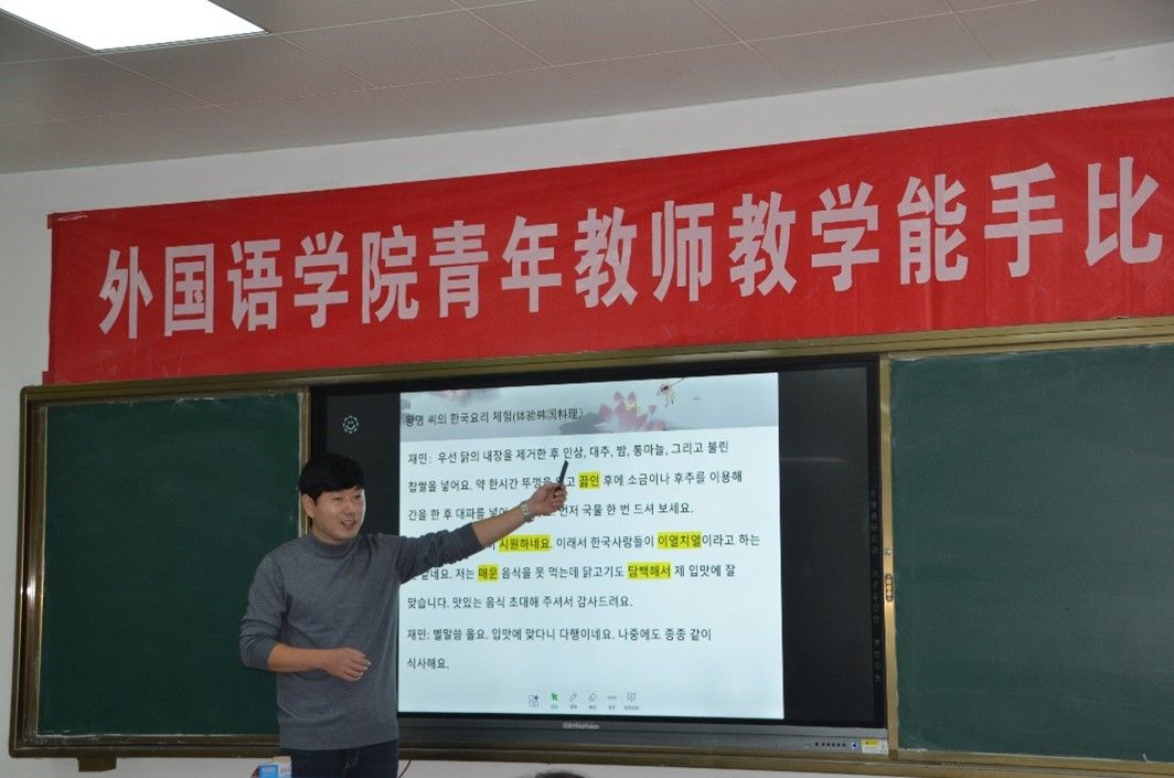 为进一步强化外国语学院青年教师教学基本功,促进其专业化发展,激发其教学激情与教学活力,为教师提供一个相互学习、相互交流、相互切磋的平台,提升教师的业务素质,外国语学院于11月22日下午在长清湖校区B540举办了学院青年教师教学能手比赛。此次院级比赛选手为来自英语、日语、朝鲜语专业的四位青年教师,学院陶业涛副院长、校级教学督导胡艳玲教授、院级教学督导组组长蒋斌副教授及各系部主任等出席此次活动。活动由王金娥副院长主持。