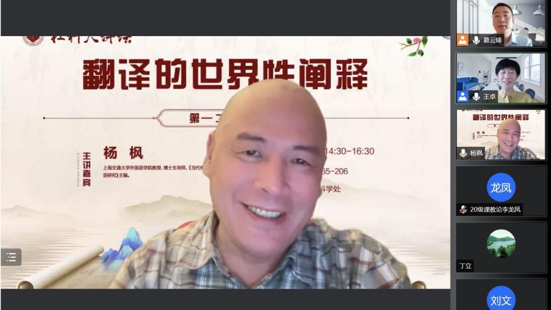 7月14日下午,山东师范大学外国语学院联合社会科学处通过腾讯会议成功举办第1237社科大论坛——翻译的世界性阐释。 本次讲坛特邀上海交通大学外国语学院教授、博士生导师、《当代外语研究》主编杨枫教授为主讲嘉宾。本次讲座由山东师范大学外国语学院院长王卓教授主持,外国语学院部分青年教师以及全体研究生参会聆听。