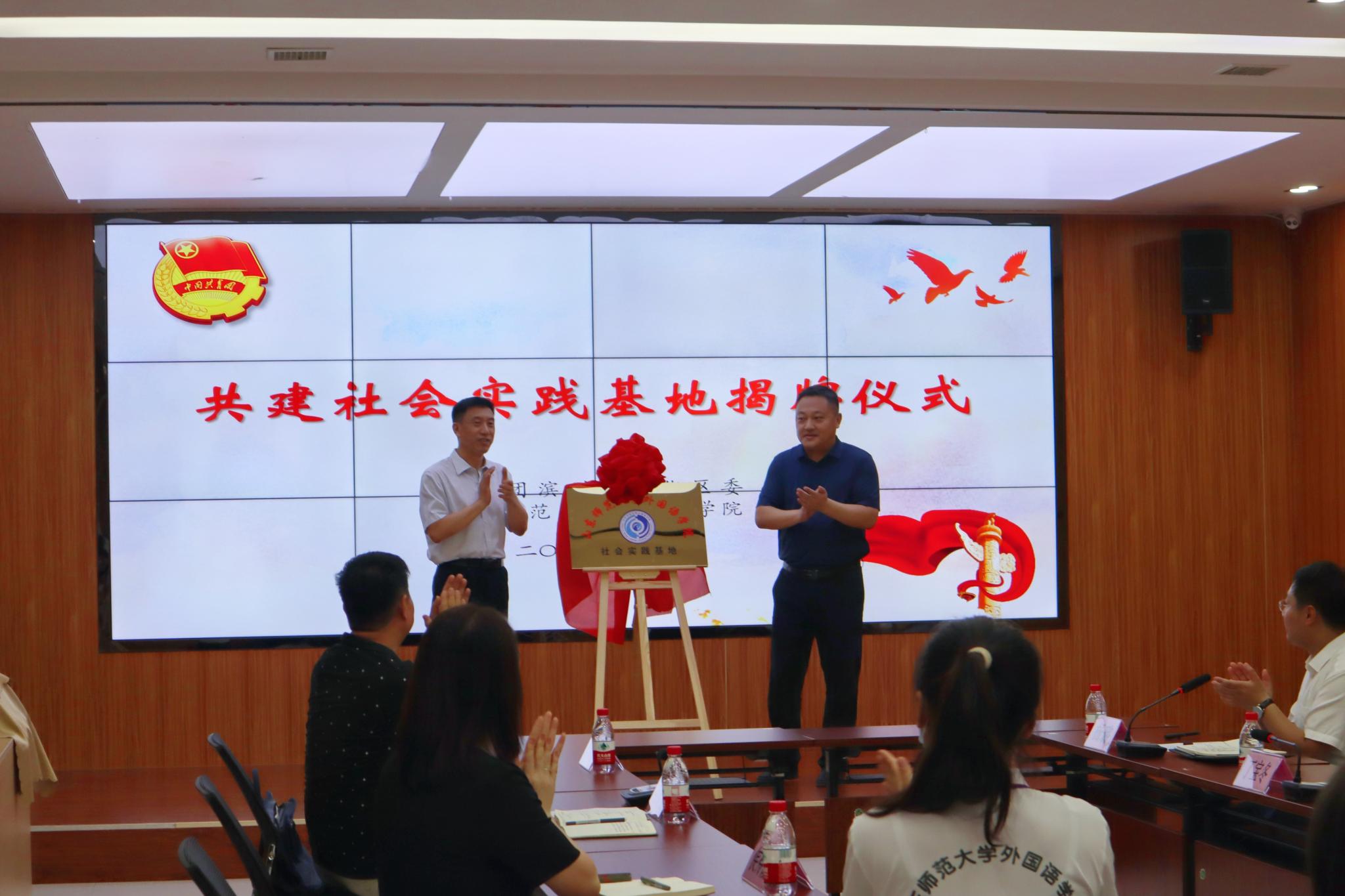 6月24日上午,山东师范大学外国语学院与沾化团区委共建社会实践基地揭牌仪式在沾化区富国街道富中社区隆重举行。滨州团市委副书记丁宝冬,沾化团区委副书记杨璐,富国街道党工委副书记、办事处主任郭明丰,我院党委书记岳希亮,党政办主任李源革,团委委员、2021级英语专业辅导员侯得霞出席仪式。各乡镇(街道)团(工)委书记,富国实验学校学生代表,外国语学院2021级暑期“三下乡”与你同行志愿服务队学生参加仪式。