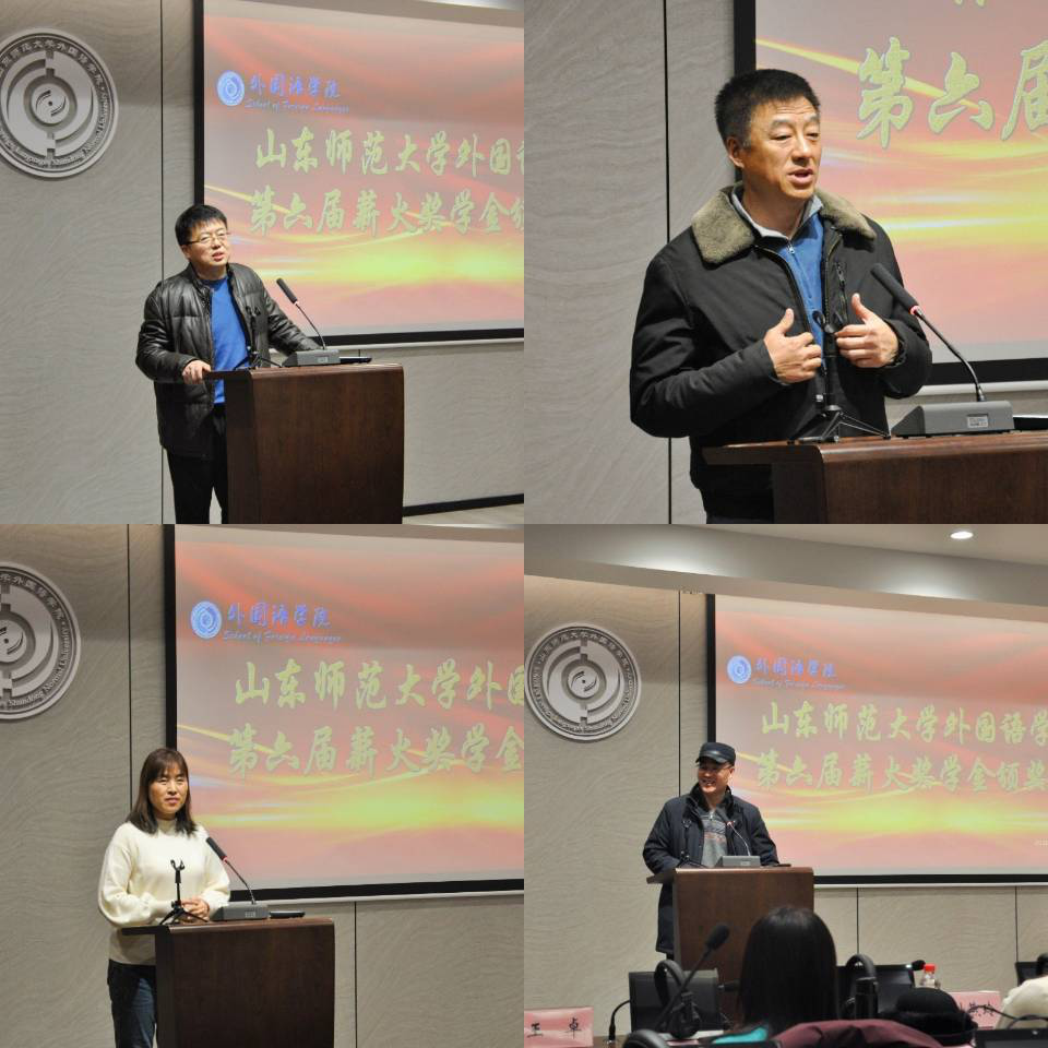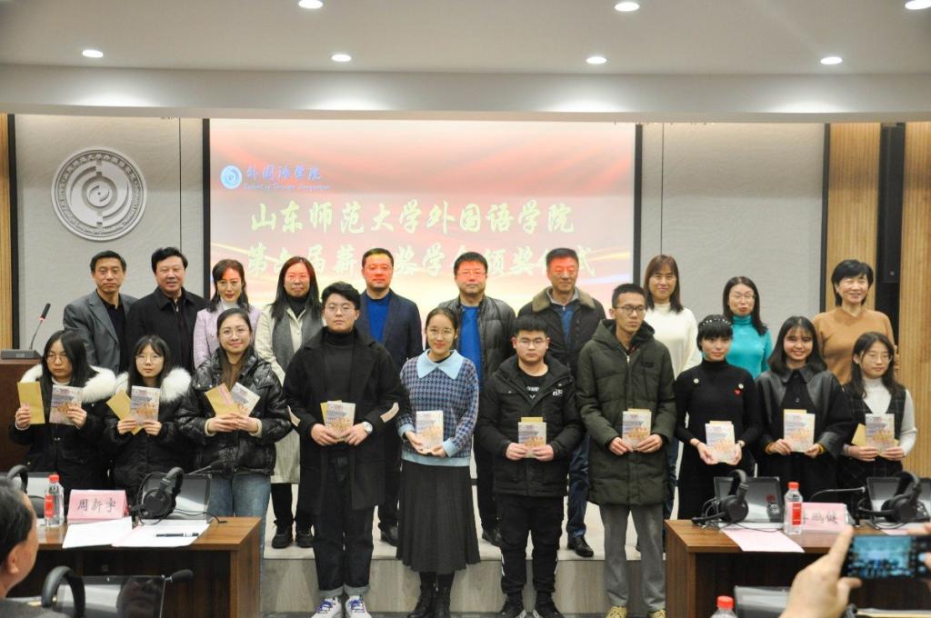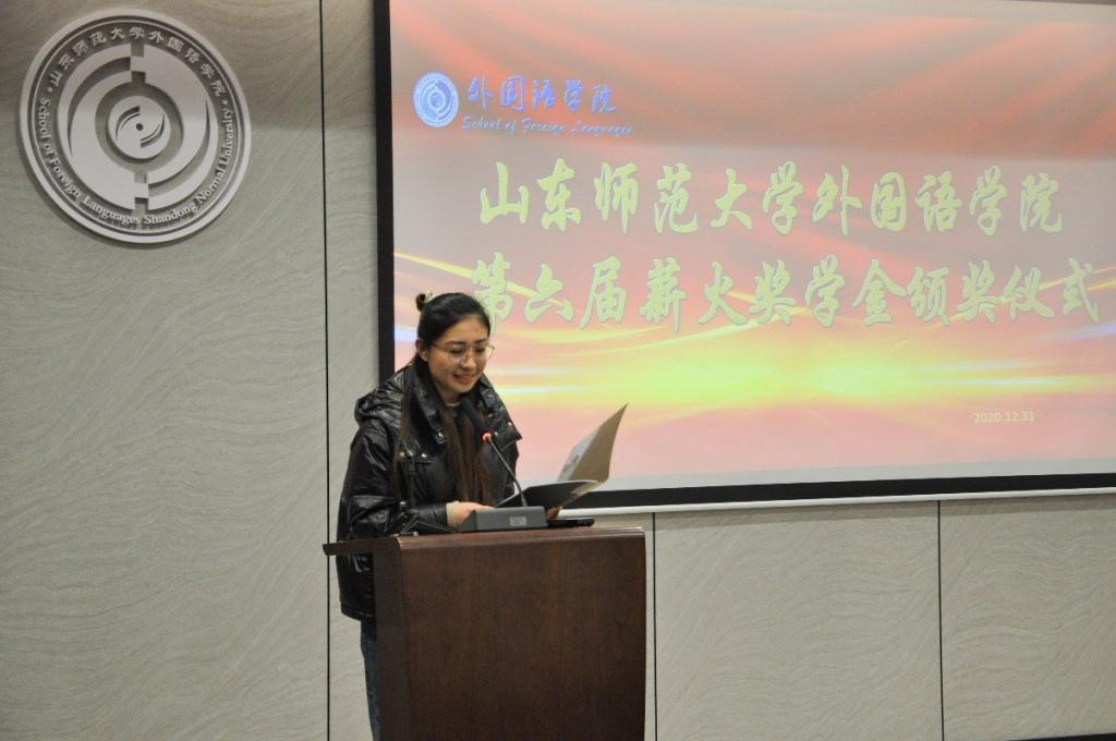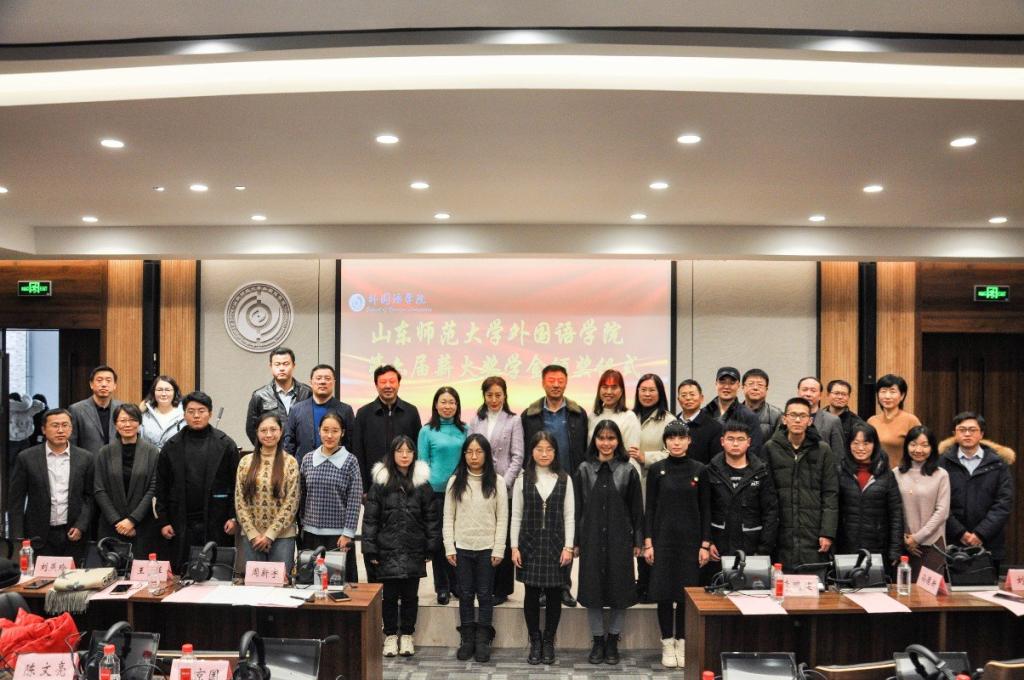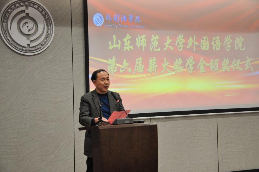 12月31日,外国语学院于山东师范大学长清湖校区文渊楼B座242多功能厅举办第六届薪火相传奖学金颁奖仪式。外国语学院88级校友孙德新、王萍、刘辛、刘燕玲、孙岩梅、刘翔宇、周志民、范庆胜、周新宇到场参加颁奖仪式,山东师范大学学生处处长李鹏健、山东师范大学对外合作办公室主任陈文亮、外国语学院党委书记岳希亮、院长王卓、党委副书记张京国、副院长王金娥、俄语系主任孙嵩霞以及全体辅导员出席本次颁奖仪式。本次颁奖仪式由外国语学院团委书记司世牧主持,2019级获奖同学以及部分2020级学生参加仪式。