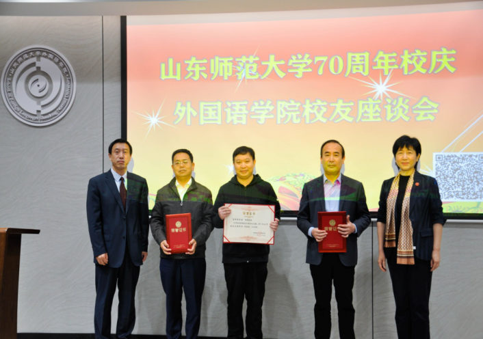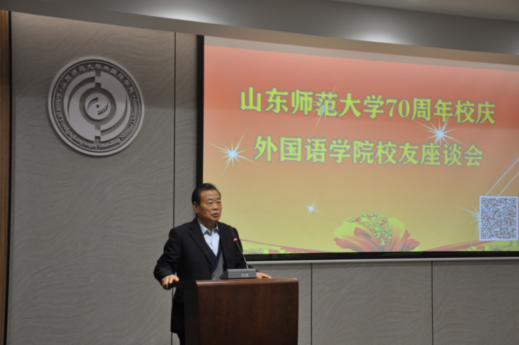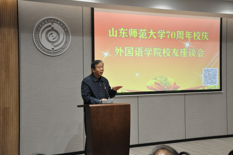 七十年岁月鎏金,山东师范大学与祖国一同成长,以辛勤耕耘孕育桃李芬芳!为热烈庆祝山东师范大学建校七十周年,增进与校友的互动交流,助力学校学院更好发展,10月29日下午,山东师范大学70周年校庆外国语学院校友座谈会在长清湖校区B区242同声传译多功能厅隆重举行。学院退休教师代表赵俊英、韩贞全、杨敏,曾在外国语学院工作过的原党委书记谭英海、原副院长巩建波等多位领导老师应邀出席活动。学院校友代表、党政领导、教师代表和学生代表们欢聚一堂,共庆母校七十华诞,共叙同窗之情。座谈会由学院工会主席侯青龙与学生代表李艺涵主持。
