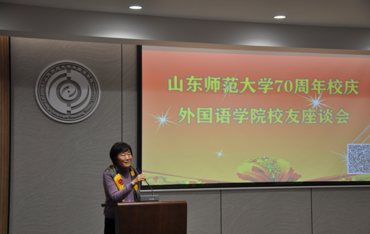 座谈会伊始,院长王卓代表学院致辞,她对来院校友表示热烈欢迎,并向校友们介绍学院近年来各项工作的发展成果、发展状况。她表示,这些成绩的取得是一代代外院人共同努力的结果,是每一位在此工作或学习过的师生共同的荣耀。“70年峥嵘岁月弹指一挥间,共同的记忆和情结熔铸其中,历久弥新。建校70周年,既是学校励精图治的展现,也是学院再谋新篇的起点,期待我们携手并进,以更加昂扬的姿态继续奋斗,以开拓创新精神砥砺奋进,创造出无愧于时代、无愧于历史的新业绩,共同绘就山师大外院更加气势恢宏的绚丽华章!”