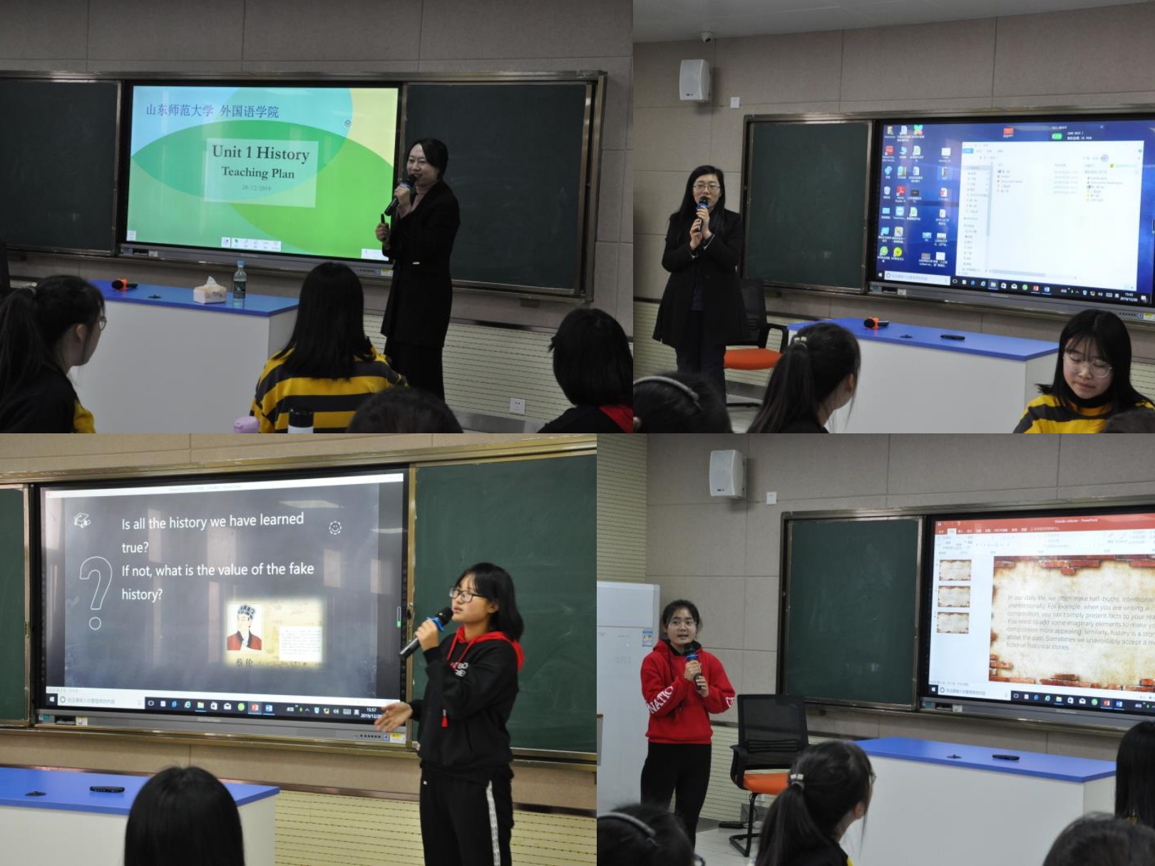 28日下午,人文英语教学展示在外国语学院B550智慧教室进行,由山东师范大学外国语学院刘震副教授主持。华中师范大学外国语学院方幸福教授以英语专业《综合英语》教学为例,展示了以学生为中心、以产出为导向的《综合英语》教学模式。该教学模式基于English Learning Circle, 提出了学生在学习过程中扮演的六种角色:Discussion Leader, Information Collector, Passage Person, Outside Collector, Cultural Collector 和Word Master。 华中师范大学外国语学院英语系《综合英语》教学团队的五位老师结合自己的教学实践详细阐述了学生在扮演六种角色时需要完成的各项工作和教师在教学过程中的作用。山东师范大学外国语学院《综合英语》教学团队的王秀香和刘焱两位老师以具体文本为例进行了说课和实际的课堂展示。之后,罗良功、刘永杰、潘震、朱小琳、俞婷五位与会专家对两个团队精彩的教学展示进行了点评,王卓院长对课程展示环节进行了总结。专家们对两个教学团队的表现给与了充分肯定,并一致认为人文英语系列教材《综合英语》凸显了人文性,必将进一步带动外语专业教学方式和理念的深入变革,与会教学团队展示的由人文系列教材推动的教学模式改革也为中国外语教育改革提供了范本。