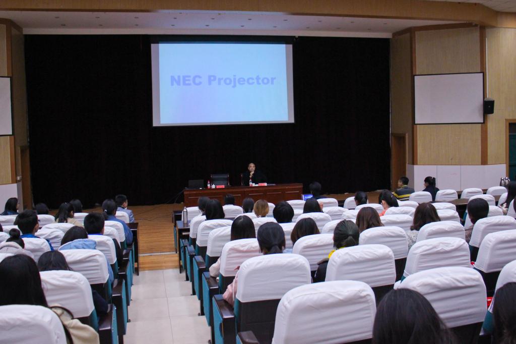 许钧教授首先由个人经历和身边亲友的职业发展轨迹引出话题,他引用笛卡尔的名言“我思故我在”向大家表明,个人能力提高和职业发展成功的前提是要有自己的思考,建立正确的职业发展观。许钧教授指出,语言的背后是一个世界,是一种精神。谁能掌握语言背后的世界,谁就能拥有掌握命运的资本。许钧教授结合自己阅读法国文学的体验,畅谈了语言和文学对人生意味着什么。他指出,在阅读鲁斯特的《追忆似水年华》中,体味到艺术让生命获得了永恒的真谛;在阅读昆德拉的《生命不能承受之轻》中,他认识到最重要的词是“being”,是“存在”。人应该思考你过的是“生存”还是“存在”,“存在”是精神意义上的,而“生存”仅仅是物质意义上的。许钧教授以诗人的语言表达了对生命的认识:人生没有草图,人生不可复制,人的生命是有限的,但人的追求是无限的。