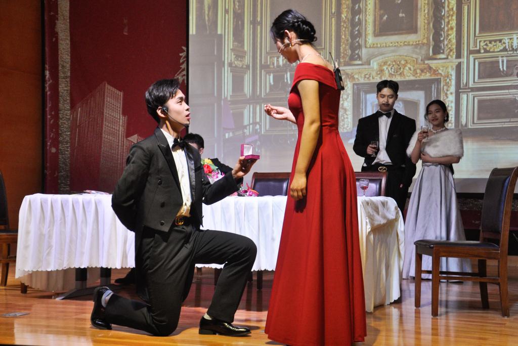 舞台灯光亮起,伴随着投影墙的中英字幕,《探长来访》正式开始。剧中演员借精致的服装,优雅的音乐,娴熟的演技和地道的英音将话剧中的人物演绎得栩栩如生。第一幕以一场轻松的家宴引入剧情,演员们真诚的表演、道具组恰如其分的灯光与音乐使观众身临其境。第二幕茜拉与吉拉德的对角戏中,人物矛盾开始凸显,两人精彩的表演与标准的英语发音赢得了现场观众的赞叹。第三幕出人意料的结尾使全剧达到高潮,现场响起阵阵热烈的掌声。戏剧通过人物性格映射现实,暗示世上有无数如自杀女子一般的人,正因为人性的缺点与社会的不公而遭遇不幸。最后,探长的结语以视频形式再现,配合上沉重的音乐,给人留下无限的想象空间。到场领导嘉宾上台与演职人员合影留念,观众有序退场。至此,话剧表演圆满落幕。