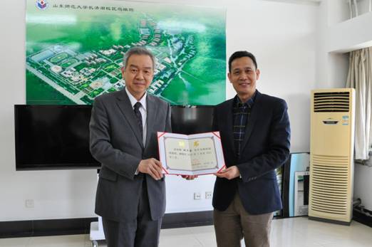 姚东方书记代表学校致欢迎辞,并为时卫国教授颁发了聘书。姚东方说,时卫国教授在日本得到了日本同行专家的高度评价,其丰富的求学经历、严谨的治学态度、高深的学术造诣给我们留下来深刻的印象。感谢时卫国教授能到山东师范大学做客座教授,希望时教授为山东师范大学外国语学院,特别是日语系的发展多做贡献,积极加强交流和支持,为日语专业的建设提供助力。