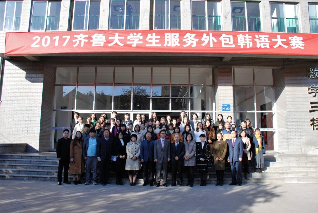 11月11日,由山东省教育厅、山东省科协、山东省高校工委、济南市科协主办,山东师范大学外国语学院、济南市计算机学会共同承办的2017齐鲁大学生服务外包应用韩语大赛在我校教学三楼3153报告厅举行,有来自省内十四所高校的50余名韩国语专业的选手及指导教师参加了比赛,比赛由济南韩国商会本部长任昌柱、山东大学韩国语系教授李成道、济南大学韩国语系教授范伟利、山东旅游职业学院教授全龙哲以及我校外国语学院东语系主任李浩等担任评委,山东师范大学外国语学院党委书记岳希亮出席了大赛并致辞。