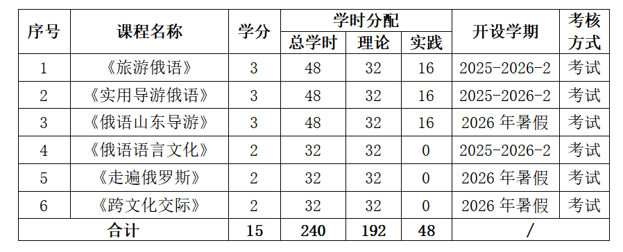 系统掌握基础俄语语言知识和常用表达方式,具备日常交流和旅游服务场景中的基本俄语沟通能力;了解俄罗斯历史、文化、地理、社会生活等方面的基本知识;掌握旅游服务基本知识和导游讲解技巧,了解跨文化交际基本理论与实践方法。