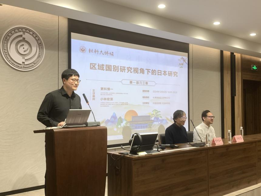 2024年12月2日晚上7点,外国语学院联合社会科学处成功举办了第1463期社科大讲坛,主题为“区域国别研究视角下的日本研究”。本次讲座特邀山口大学人文学部、人文学研究科及东亚研究科的更科慎一教授和小林宏至教授作为主讲嘉宾,由外国语学院日语系教师郭睿麒博士主持。日语系主任崔颖副教授、副主任孙守峰副教授及宋炜博士等日语系教师、研究生和本科生一同出席了此次讲座。与会人员不仅认真聆听,还在互动交流环节表现出极大的热情与积极性。