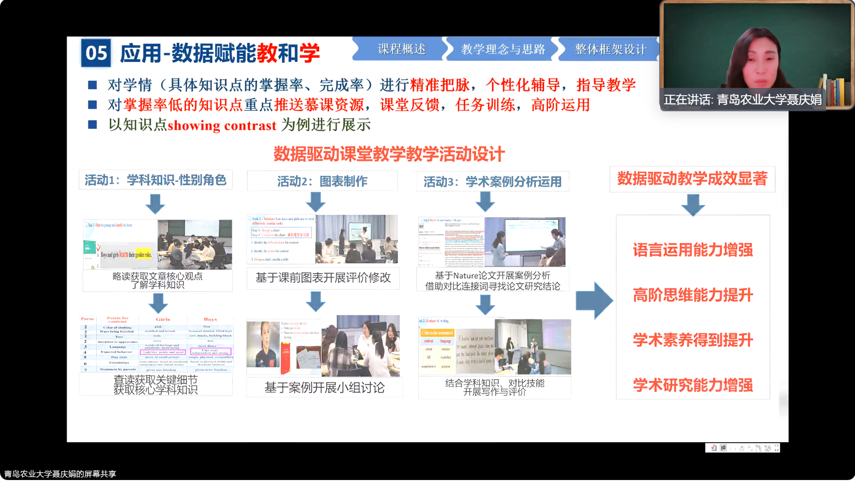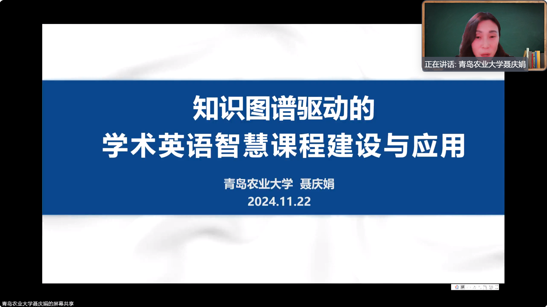 为更好的响应学校leyu·乐鱼(中国)官方网站推进智慧课程建设的号召,加快我院课程知识图谱建设的步伐,外国语学院教师教学发展中心于11月22日晚特邀青岛农业大学外国语学院大学英语第二教学部主任、省线上线下一流课程负责人、省课程思政示范课负责人聂庆娟教授,为我院教师开展了题为“知识图谱驱动的学术英语智慧课程建设与应用”的专题线上讲座,分享知识图谱建设的宝贵经验,为我院各门课程知识图谱建设提供了新的思路和带来了新的启发。讲座由副院长张媛主持,学院参与知识图谱建设的课程负责人和成员、各系部骨干教师参加了讲座。