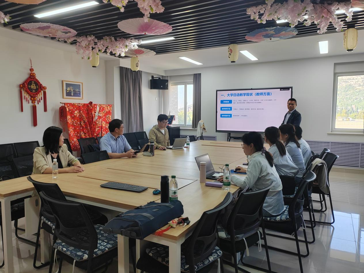 研讨会分为两个阶段。第一阶段由孙守峰主持,参会教师畅谈在大学日语教学过程中遇到的问题,并提出解决方案。第二阶段由孙守峰主讲,从学生方面、师资方面及教学管理方面分析了大学日语的现状及问题,同时从多个角度提出了对策建议。研讨会上,参会人员从教学实际出发,不谈空话套话,一致认为应该改变课堂教学方法,激发学生学习兴趣,通过大学日语学习助力其职业生涯规划,为有意愿赴日留学学生提供信息,也探讨了分级教学的困难和可行性,对教务管理也提出了建议,比如统一安排考试,通过在工作日固定某一时间段为大学外语(英语、日语、俄语)排课,避免周末上课给学生带来的懈怠思想。研讨会上的意见建议未必能马上实施或被采纳,但是,通过研讨,统一了思想认识,激发了老师们在大学日语方面的教研热情。