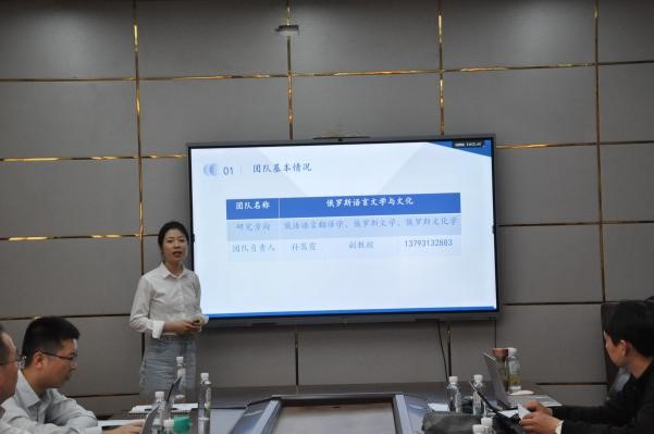 会议伊始,王卓院长介绍了第一届“师生学术共同体创新与发展团队”的六个团队,分别是毕晓毅负责的“中国教育话语传播”、胡艳玲负责的“英语课程与教学论”、宋来全负责的“认知教学创新与发展”、孙嵩霞负责的“俄语语言文学与文化”、王秀香负责的“基于《综合英语》的课程教学与研究”、翟乃海负责的“当代英语文学跨学科跨媒介研究”。六名团队负责人依次对团队基本情况进行了汇报,内容包括:团队成员组成、团队建设情况、项目成果与后期规划。