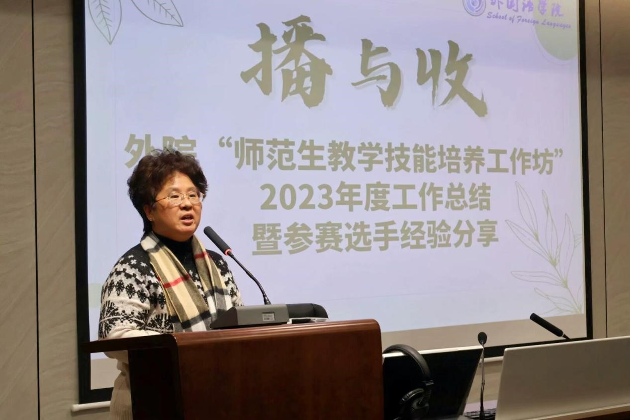 会上首先由王锦老师对2022年至2023年师范生教学技能培养工作坊的工作成就进行总结。她指出,工作坊自2019年6月成立以来的四年时间,始终以当前各类师范生从业技能大赛人才选拔和培养为切入口,打造有利于学生专业成长、有助于教师专业发展的学院人才培养和教师专业发展的共同平台。经过工作坊培养,我院学子在全国和全省范围重要师范类技能竞赛中收获颇丰。尤其是在2022年和2023年,工作坊团队师生共斩获国家级一等奖2人次、省级一等奖项7人次、省级二等奖6人次、省级三等奖5人次。其中2022年的“第十届山东省师范类高校学生从业技能大赛”外国语学院6人团队战绩卓著,共获得4个一等奖、1个二等奖、1个三等奖的优异成绩;在2023年“第十一届山东省师范类高校学生从业技能大赛”上,我院共有10名同学获得省赛决赛资格,成为我校各学科各专业获得决赛资格最多的一支参赛队伍,并最终获得3个一等奖、4个二等奖、3个三等奖的好成绩。我院2020级英语专业王艺超同学同时获得国家级和省级师范类高校学生教学技能大赛3个一等奖项,成为一颗耀眼的教学新星。