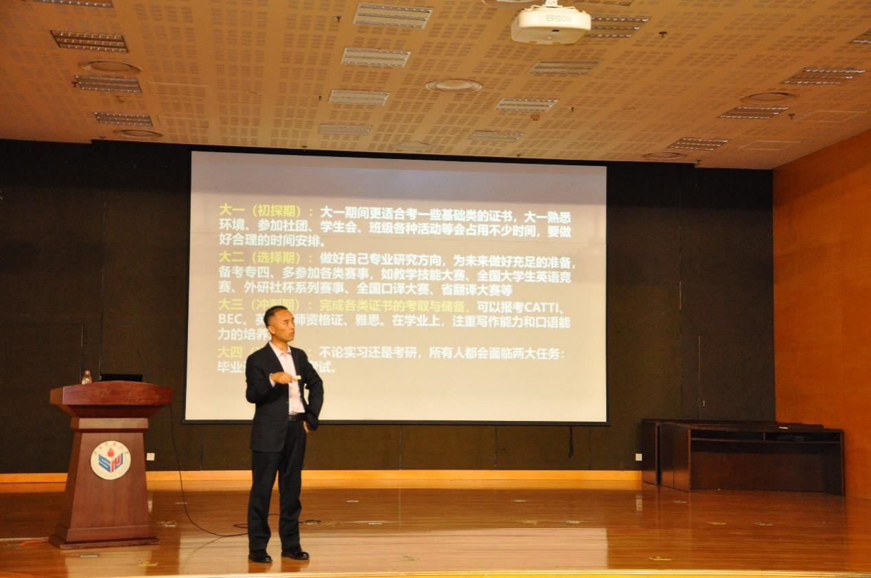 2023年10月25日下午,外国语学院在长清湖校区图书馆负一楼报告厅成功举办《国际人才英语》课程校外导师进课堂暨国际人才培养系列讲座。本次讲座邀请行业导师、济南橙玥电子商务有限公司创始人、高等院校互联网+创新创业导师评委孙虎先生为我院2023级本科生开展了题为《外语类专业就业前景与规划方向》的主题讲座。外国语学院院长王卓教授、大学外语教学部韩冰主任出席了本次讲座。