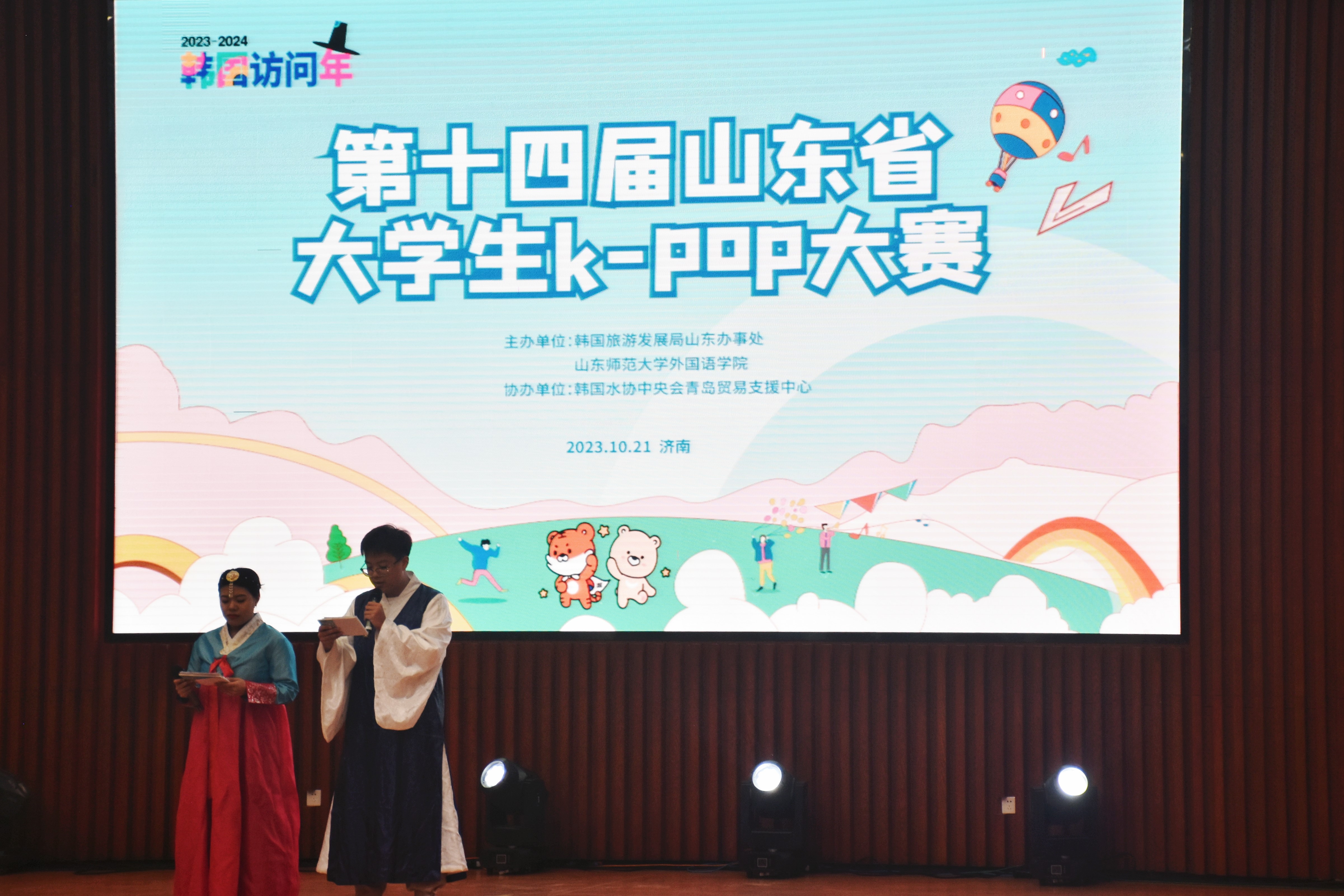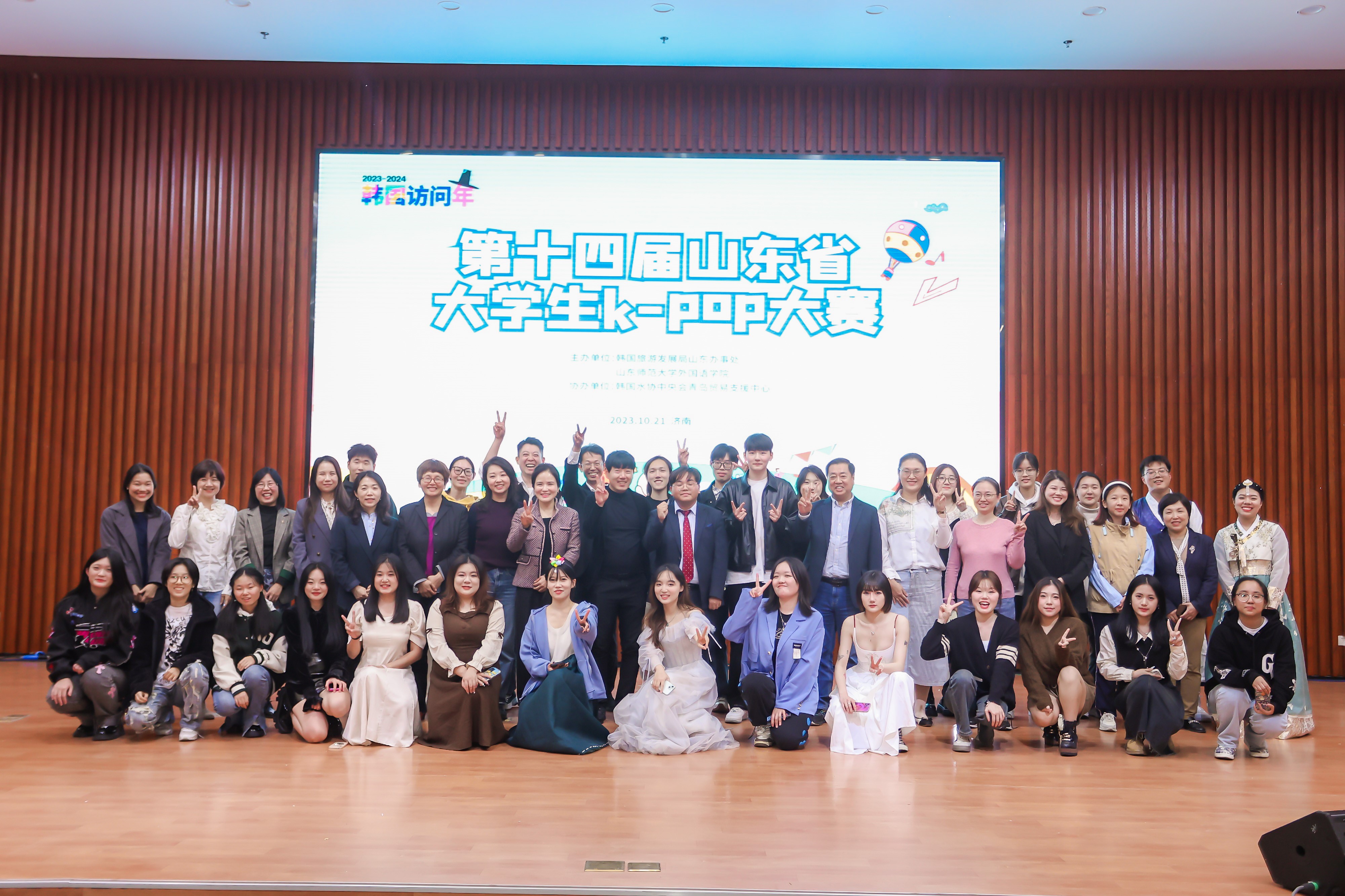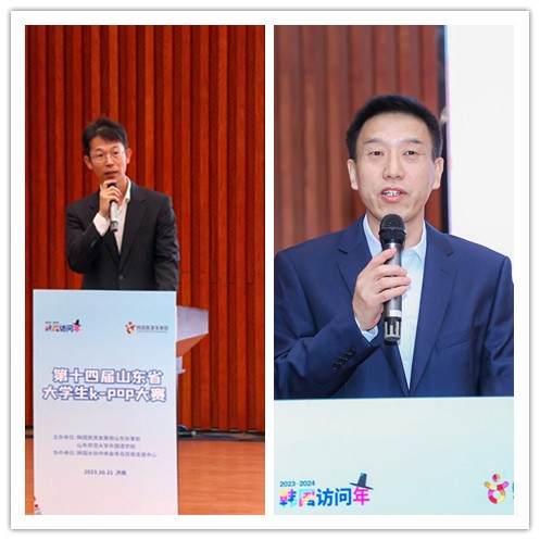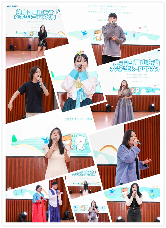 2023年10月21日,由山东师范大学外国语学院联合韩国旅游发展局主办,韩国水协中央会青岛贸易支援中心协办的第十四届山东省大学生K-POP大赛在山东师范大学文昌楼105报告厅举行,韩国旅游发展局山东办事处代表李洪根、山东师范大学韩语系外教崔惠景、山东师范大学音乐学院钢琴专业老师牛瑞熙、吕欣锴等担任此次大赛的评委。