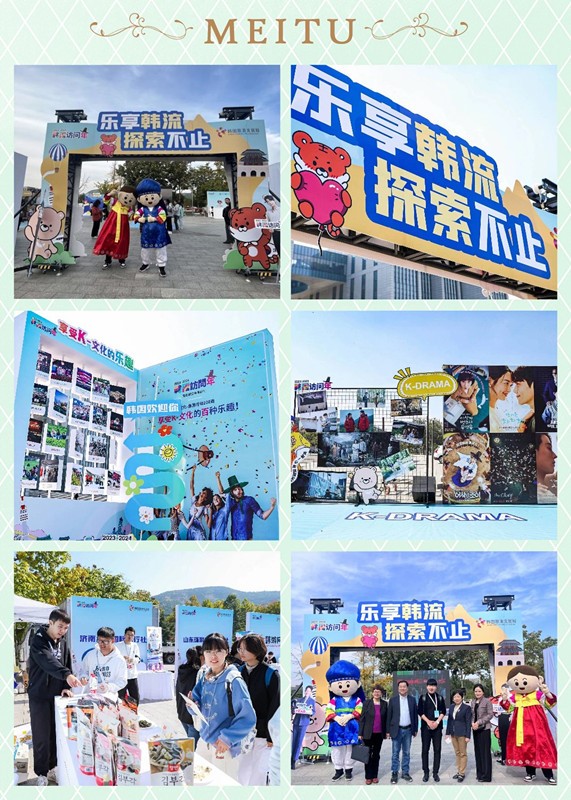 当天,除了室内举办的“第十四届山东省大学生k-pop大赛”,还在校园内搭建了“乐享韩流,探索不止”韩流主题体验区,在校师生可以在韩流体验区穿韩服拍照打卡、体验韩国传统游戏、品尝韩国特色美食等。在主题体验区还为大家展示了韩国政府为配合“2023-2024韩国访问年”,精心挑选出的适合外国游客体验的“k-文化旅游活动100选”相关内容,从各个方面向到场师生展示韩国特色文化。